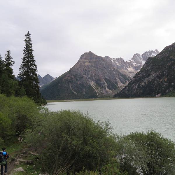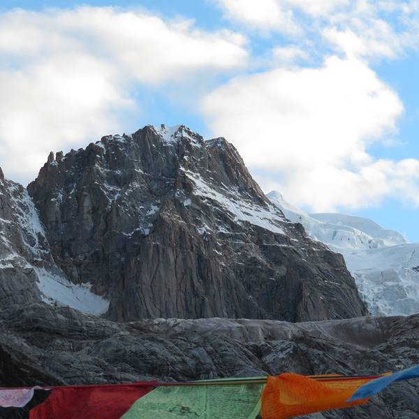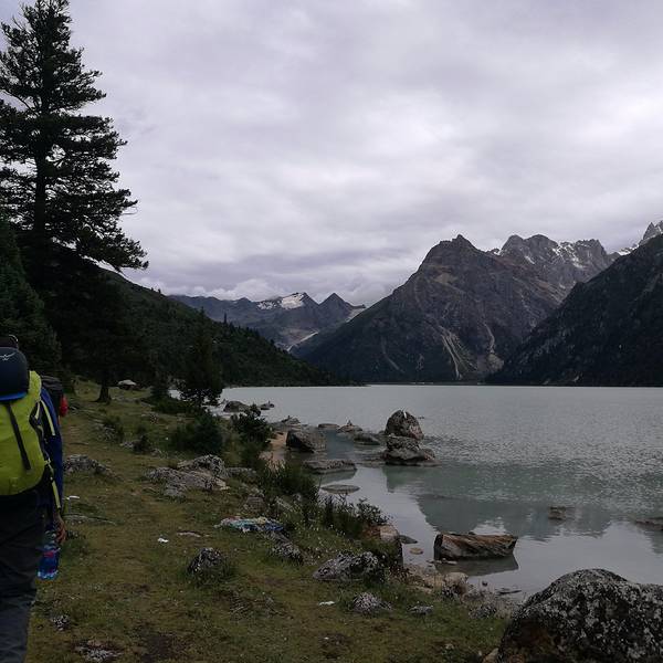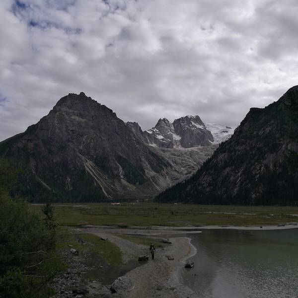 这里已经可以看到雀儿山屹立在你的面前了,不知怎么的,我感到了一种令人生畏的气势。这里我们集合,穿戴好低海拔装备,正式开始雀儿山的征程。玉隆拉措湖,应该是天气不好的原因吧,还是一心只想着往雀儿山去,湖很安静,但是它的颜色显得十分冰冷。好像没一座雪山下都有这么一座湖。这时这里还有一些自驾的游客,他们也在这里玉隆拉措湖的美景,但是他们便止步于此,见我们背着一些大包小包,若是在城市里面出现,再伴随一点灰头土脸,非被人家当成是过年回家外出拼搏的流浪者不可,这时候却能得他们一些崇敬的眼神,仿佛看到了一些勇敢的人走向他们无法走向神秘之处,去征服那不可预料的冰裂缝,恶劣气候和高海拔,对于他们来说,山顶一定是十分遥远和难以抵达的地方。而我们登山者又何尝不是如此呢,每个人都怀揣着一种不约而同的梦想,梦想站在高山之巅,眺望群山,似乎不需要再抬头仰望天空,因为你已经仿佛站在云层之上,俯瞰白雪皑皑,可却像是看到了万物众生,若那时有晨曦之光刚好刺破天际散漫峰顶,那时多么如此一种波澜壮阔的绝顶气势,我愿在那山顶肆意呼喊,肆意呼喊。