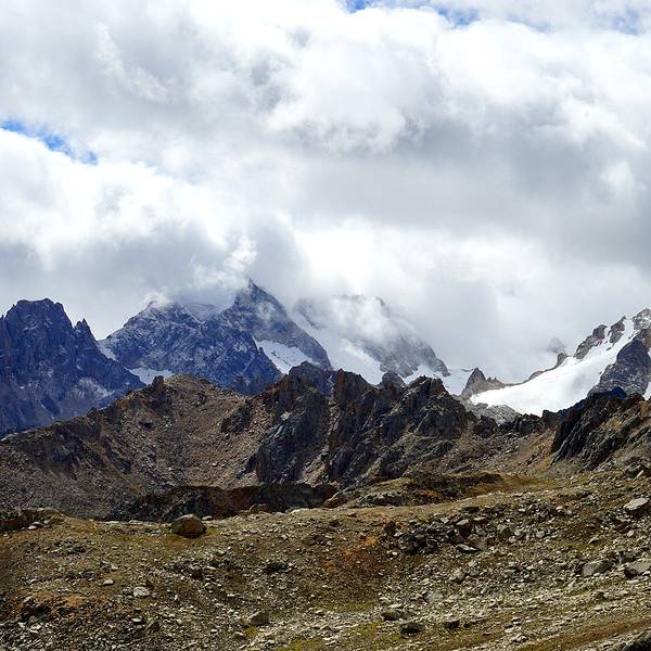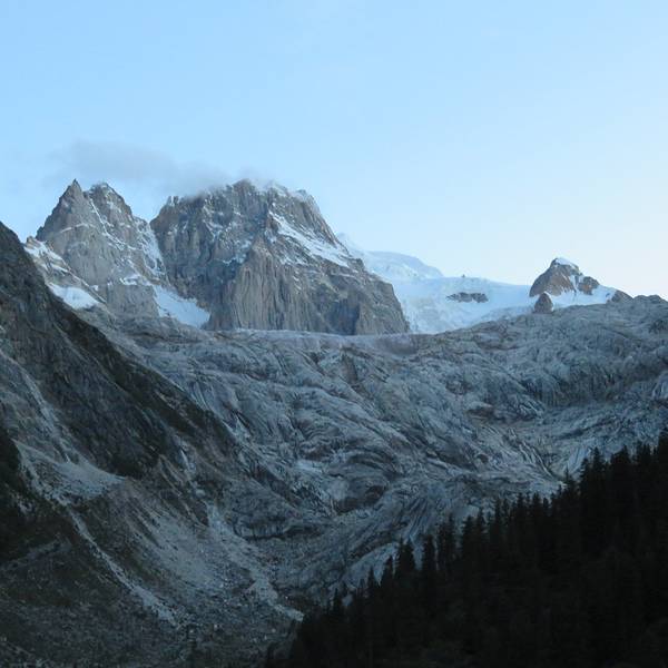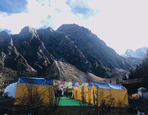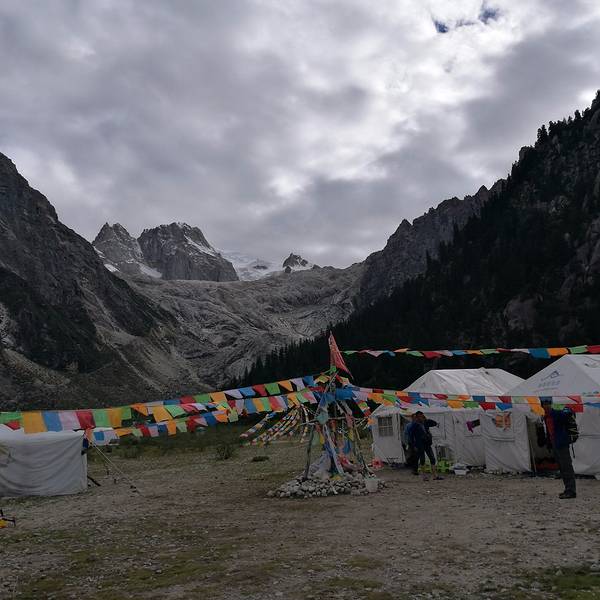另外,这里的藏民是集体经济,每名村民(不管男女老少),都需要定期轮流的有义务的到山上去履行背夫的职责,所得报酬都得充公,然后再由村里统一分配,这种独特的藏民自主的基础经济体制,确是实现这里稳定很重要的因素。当然,撇开金钱不谈,我觉得这里的藏民是十分友善的,毕竟除了登山者以外也很少受其他大规模的商业旅游影响,虽然不如阿里和青藏交接的那些藏民淳朴,但比日喀则某寺的某些寺庙工作的拿国家工资的藏民同志好到不知道哪里去。藏族向导老金,虽然没有带我们上山,他帮我把小包背到大本营,十分感谢。约17:00,顺利的抵达了大本营,基本上没有什么体力消耗,悠哉悠哉晃过来的,优哉游哉的坐在大本营喝茶,向导会安排好晚餐,这便是商业攀登的舒服之处了吧。我们的营地是在一个山谷之间,前面是向雀儿山去的上山路,而后面就是河滩,我们就住在最大意义的雀儿山山脚下了,除了我们的营地,还有另外一个登山公司川藏队的营地,看起来他们的“全景帐篷”似乎比我们的“工地帐篷”要豪华不少,不过徐老幺的队伍,对比之下虽然稍显寒酸,商业专业化也稍弱别人,但毕竟带队经验最早也最丰富;远处还有高松的帐篷,他也弄了公司,是我父亲好友,还在自己亲自带队上山。这次徐老幺自己却没有上山,多多少少,有些影响。