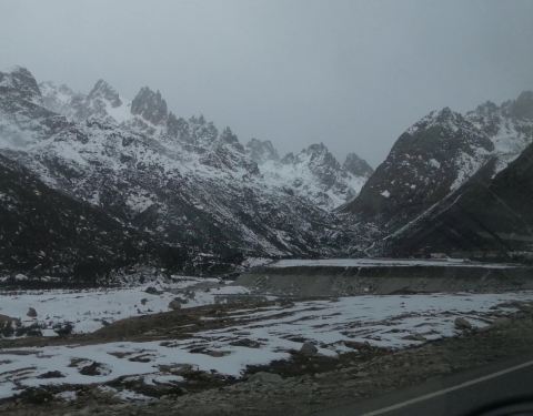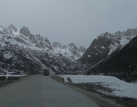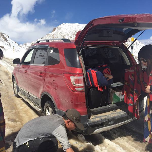 雀儿山这段山路,积雪很深,一路很险,在半路上,车滑胎了,于是在半路上装起了防滑链,为了确保安全,我们下车,徒步到了雀儿山垭口。