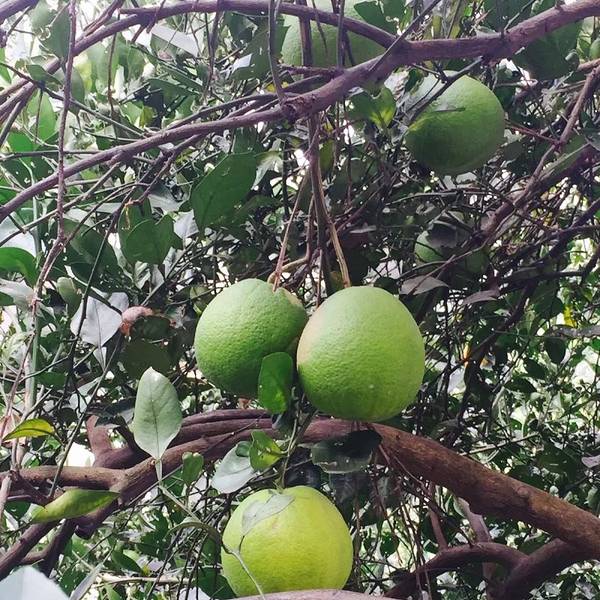 明黄色的墙壁 黑色的瓦片屋顶 旁边还有缀满了柚子的柚子树