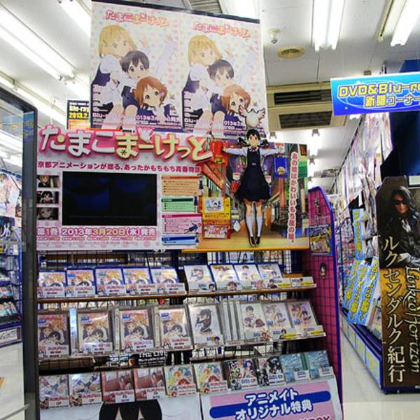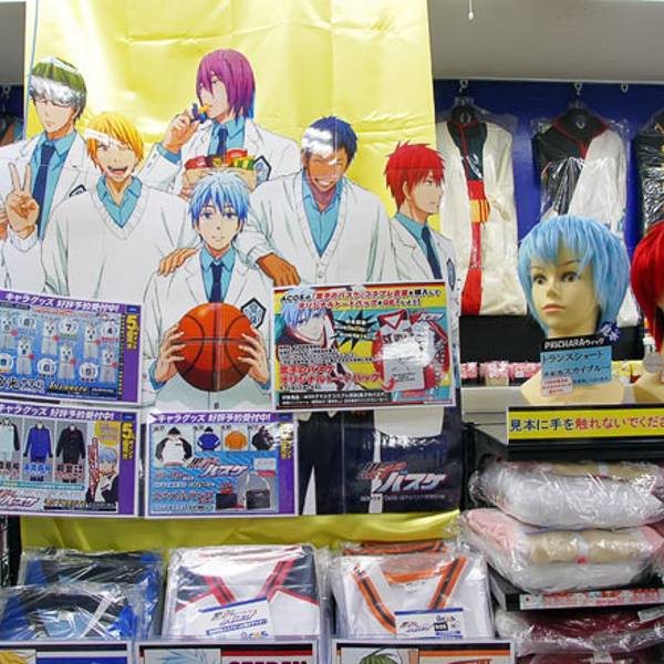 来到了animate秋叶原店,一层的cosplay周边区,原来布满了货架的《轻音》《凉宫》cosplay服装全都不见了,现在主打的内容是《黑子的篮球》,墙上挂着的也都是《magi》《银魂》等,看来在animate,的确是女性向内容更热销。