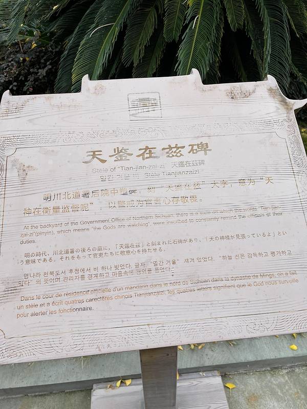当你跨进川北道署仪门,门前是曾国藩的警示对联,大门后是官员们洗濯浊心的柏台亭和取节轩,宋太宗赵光义所始建的“公生明”戒石坊,背后还有北宋书法家黄庭坚所书的“尔奉尔禄,民膏民脂,下民易虐,上天难欺”十六字,甚至高潮处在大殿背后有一个巨大的“廉”字;看到这些,你是不是感到很震撼?