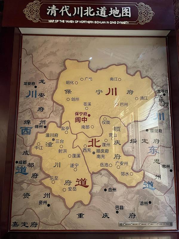 据史料记载:川北道署,俗称道台衙门,明代洪武四年(1371年)始设川北道台,辖保宁府、顺庆府、潼川州等31州县。清代初年,四川巡抚、布政使、按察使驻保宁,阆中作四川省会十余年;乾隆18年,定制为“川北分巡兵备道”,辖保宁、顺庆、潼川等25州县。民国初年,先后设川北宣慰使署、川北观察使署、川北道署,辖今南充、广安、遂宁、巴中、广元五市大部分及中江、安岳、乐至等26县。川北道设置阆中历经542年,如此历史悠久的道署,在这风水宝地中能驻足500多年,自然是它的绝佳风水了。