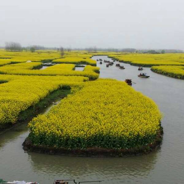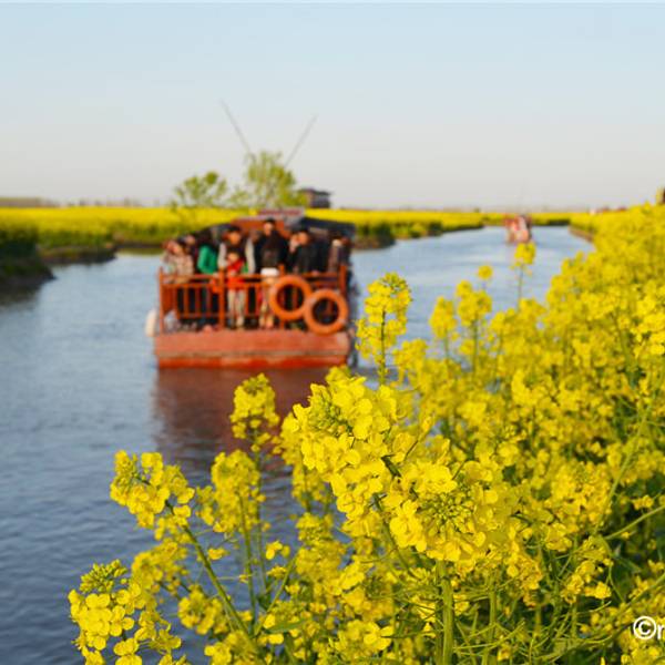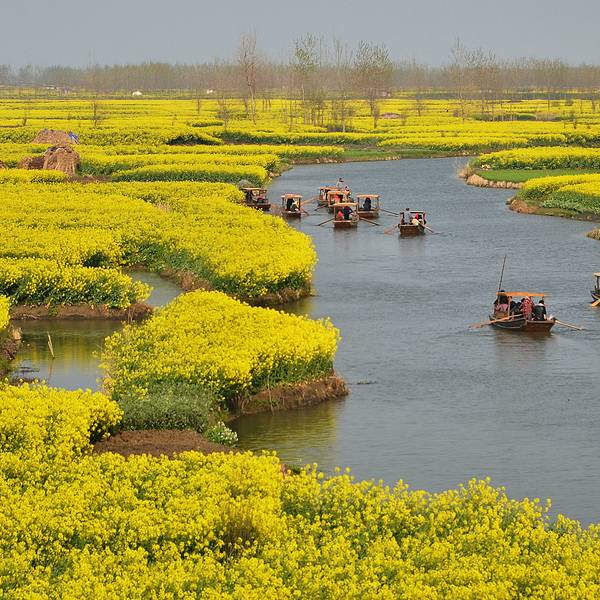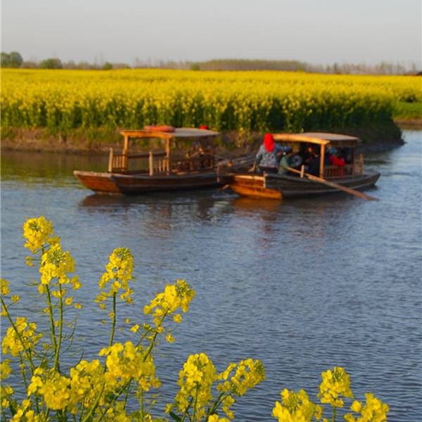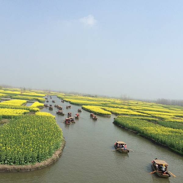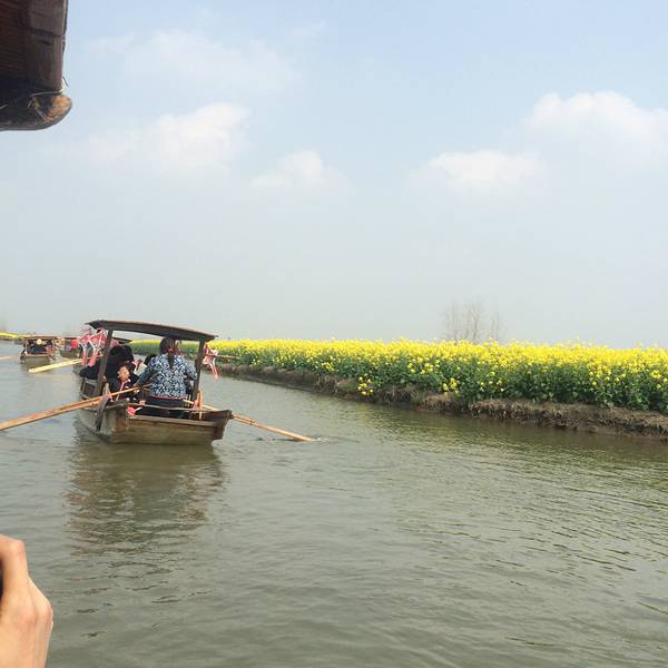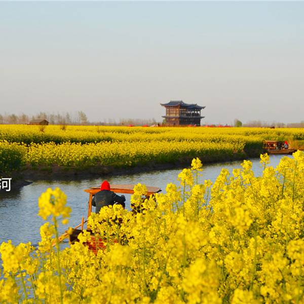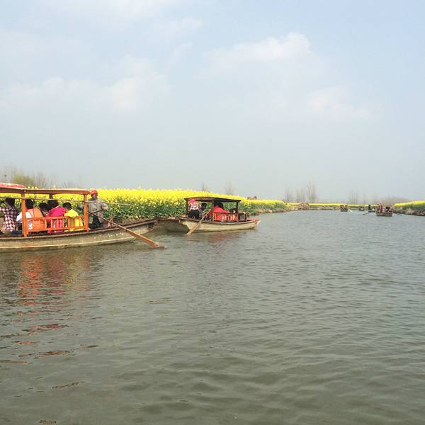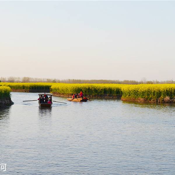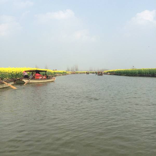 “河有万湾多碧水,田无一垛不黄花”,乘船于花海中游览,方式如同白洋淀,但周围是大片的油菜花而不是芦苇荡啊。