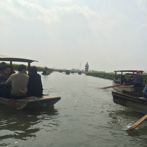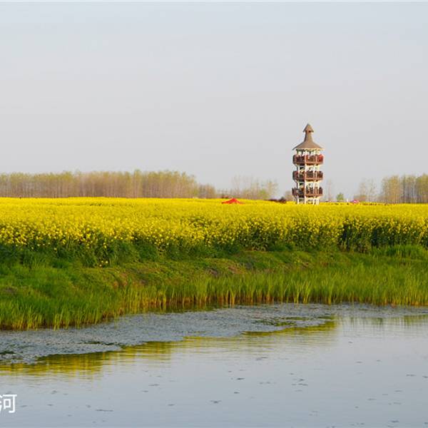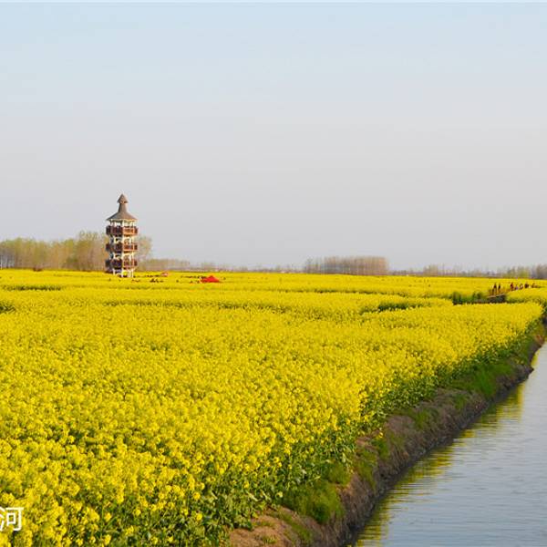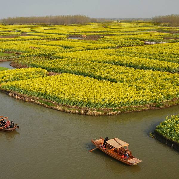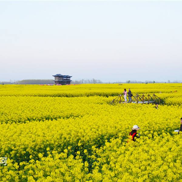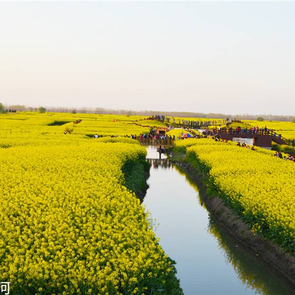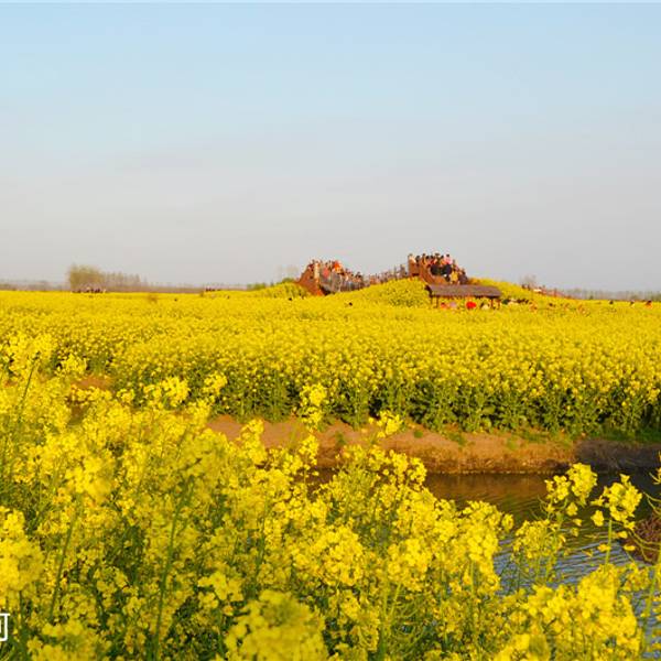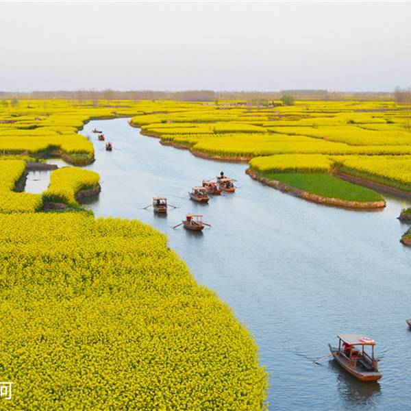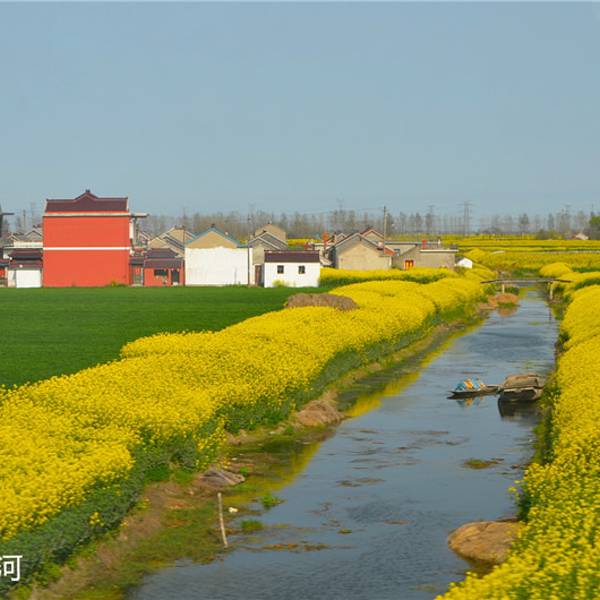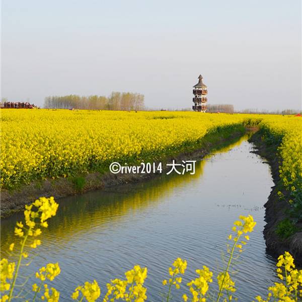 “河有万湾多碧水,田无一垛不黄花”,乘船于花海中游览,方式如同白洋淀,但周围是大片的油菜花而不是芦苇荡啊。
