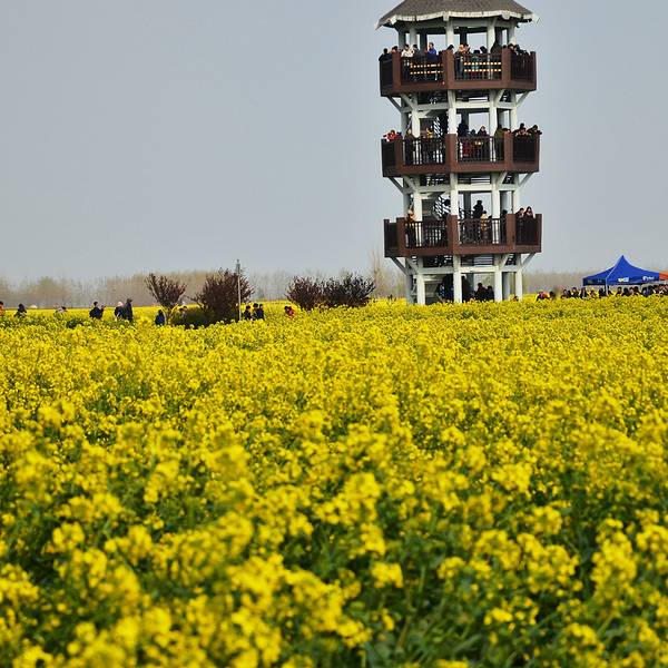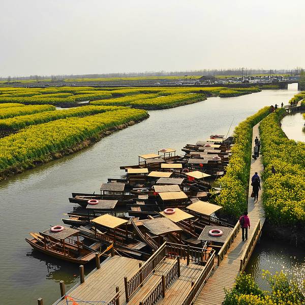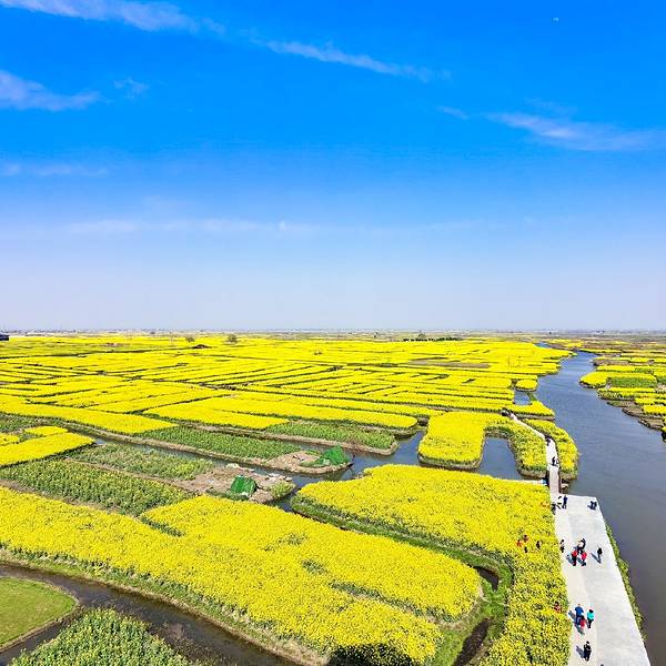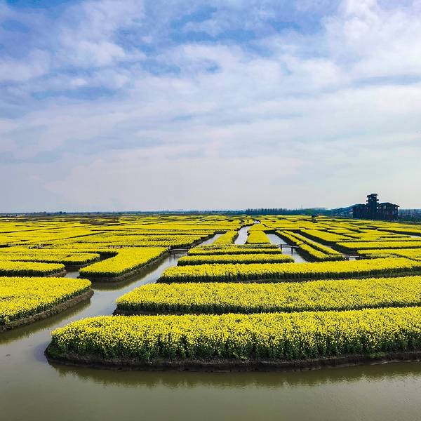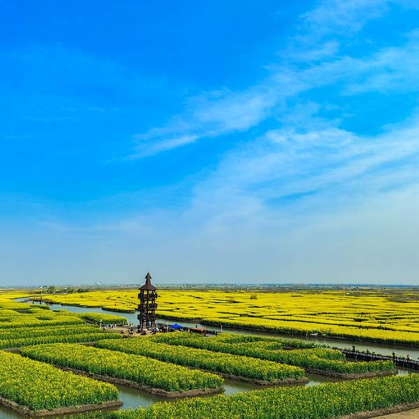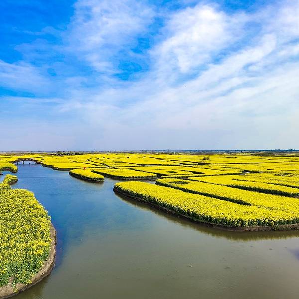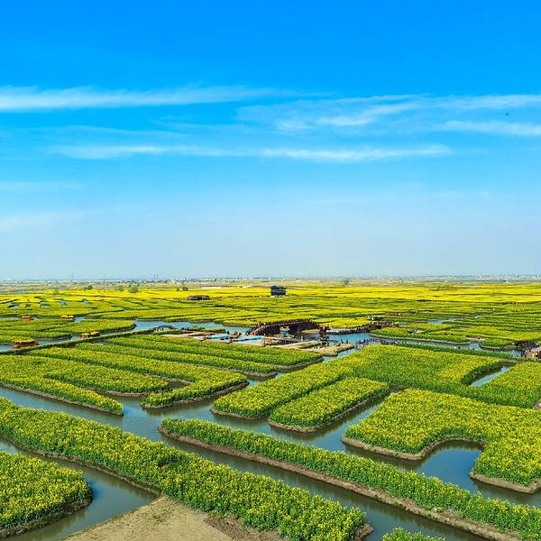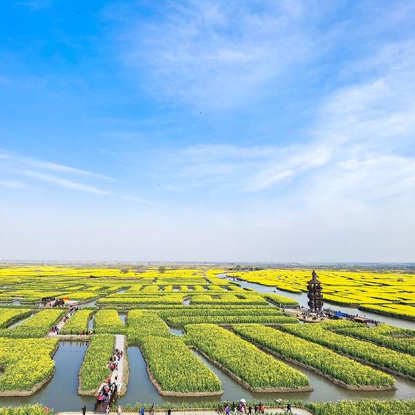 每年清明时节,千垛景区四面环水的“垛田”上长满了金黄色的油菜花。一幅“油菜花开金满地”的壮阔美景,吸引了众多前来观光的游客。“河有万湾多碧水,田无一垛不黄花”正是兴化垛田菜花的真实写照。