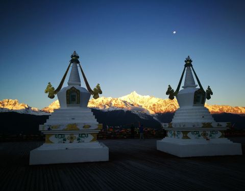 卡瓦格博峰是梅里雪山国家公园的主峰,藏语意为峡谷中险峻的白色雪峰。海拔6740米,相传为藏传佛教宁玛派分支伽居巴的保护神,位居藏区八大神山之首。梅里雪山国家公园海拔6000米以上的山峰有13座,簇拥在主峰卡瓦格博峰的周围,俗称太子十三峰。每当天气晴朗,霞光升起,万道金光直射群峰,雪峰披上金色光芒,这就是“日照金山”,是很多游客梦寐以求难得一见的胜景。 游玩卡瓦格博峰的推荐时间是每年10月到来年5月间,这段时间天气晴好,能见度高,神山被遮挡的几率非常低。到6、7月份进入雨季后,则很少能一睹真颜,只能看个人运气了。要拍摄卡瓦格博峰全貌,有两个不错的地点:飞来寺观景台和德钦迎宾台(十三白塔处)。飞来寺因地理位置原因,已发展成为一个繁华的小村镇,客栈餐馆一应俱全,宾馆的档次从几十元到上千元都有,可自行选择。 梅里雪山国家公园延伸出多条冰川,明永冰川就位于卡瓦格博峰下。从山脚下的明永村出发,沿着蜿蜒的山路上行,约两小时即可抵达太子庙,稍事休息后,一鼓作气登上明永冰川观景台,观景台上可近距离观赏冰川,感受冰川的魅力。运气好的时候,能看到冰崩,大片的冰川承受不住重量,发生崩塌,发出巨大的轰鸣,非常震撼。 上下明永冰川观景台,全程步行约4小时,体力不支的话,可以提前在山路入口处租借马匹代步。建议一定要在入口处租马,半路上的话,就算有空的马匹,当地人也不会租给你坐。 卡瓦格博峰至今仍是未被登顶的峰。从上世纪初开始,多国登山队多次试图登顶,均无功而返,尤其1991年的中日联合登山队,更是遭遇雪崩而导致17名登山队员不幸遇难。1996年,中国政府明令禁止攀登这座雪山,给予了神山永远的宁静。