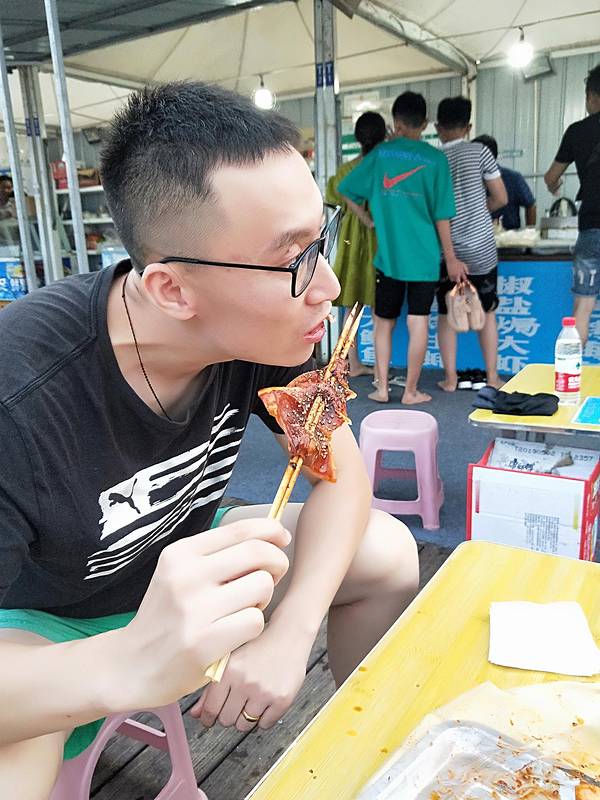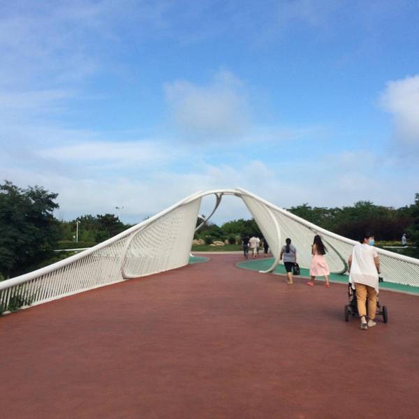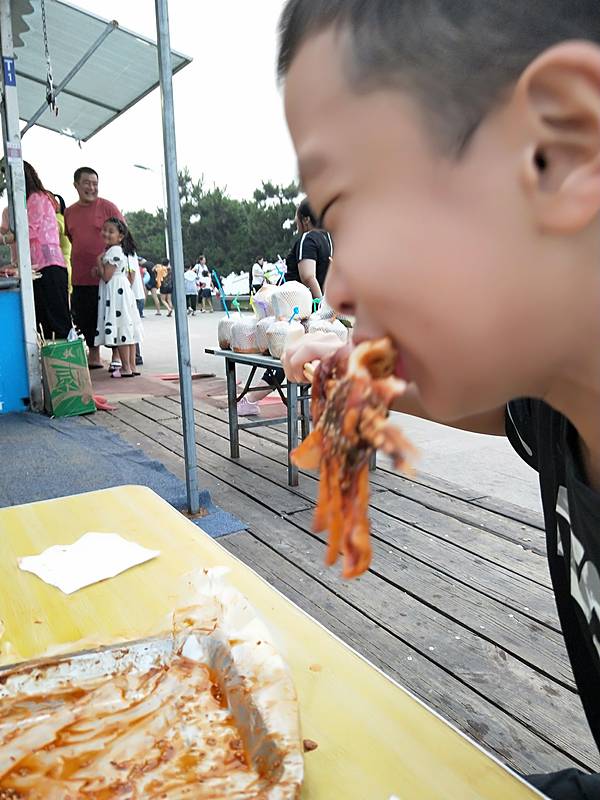 马路与海边中间是绿色植物相隔开的,所以这里也显得是林海相接了。穿过森林,首先看到的是这个浴场的换衣间,其设计的非常个性,像两只将要远航的轮船,顿显高大上,去里面换泳衣是3元钱。再往里走便是一些小商贩的商业行为了,铁板鱿鱼,煎饼果子等,看到这些,作为吃货的我便禁不住诱惑,来了一个煎饼果子,我老公来了一根烤肠,总共花费8元钱(煎饼果子5元,烤肠3元),这个价格在景区里面还算比较亲民的。紧挨着商业街的便是一望无垠的大海,由于是涨潮时间,海浪彼此起伏,显得波涛汹涌,让我真真正正的有了面朝大海,春暖花开的感觉,而儿子却在我怀里睡的不亦乐乎。