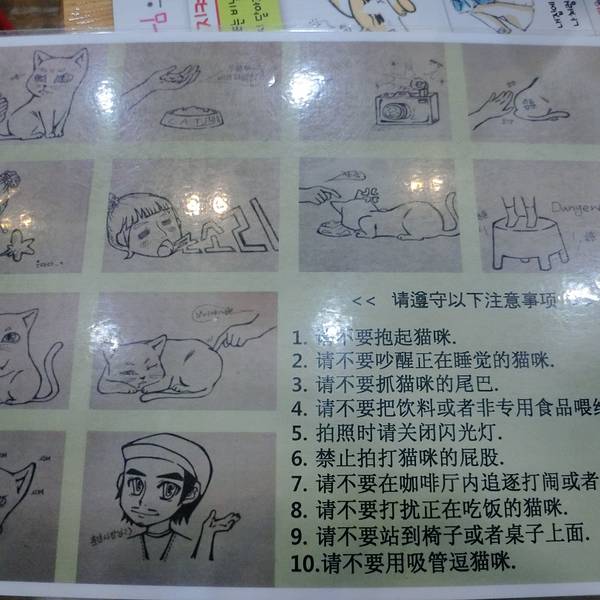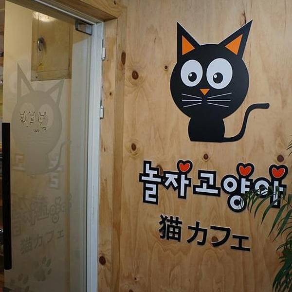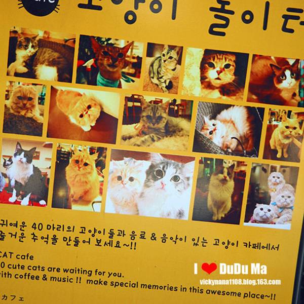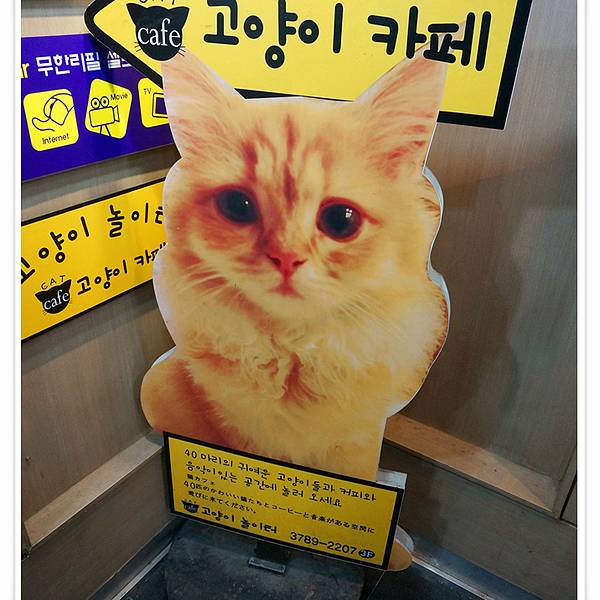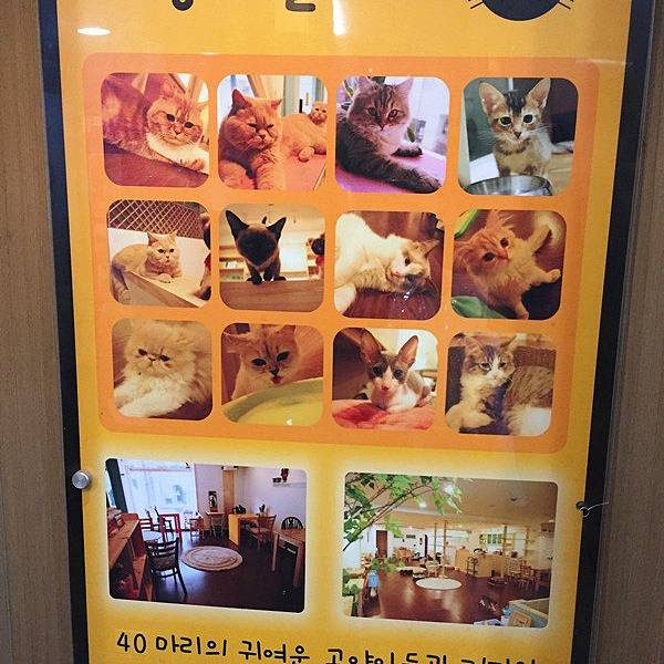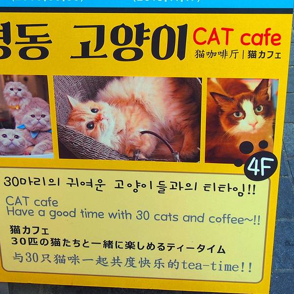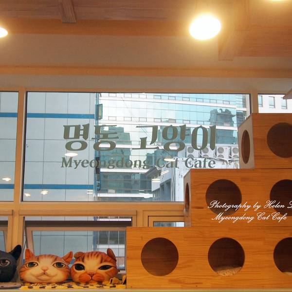 眼看时间逐渐接近3点,我们果断放弃了弘大的行程,决定回明洞酒店先取行李。而且最重要的是,我打算去梦想中的明洞猫咪咖啡厅看一看。它是我在酒店大堂的“明洞咖啡厅指南”上偶尔发现的,听说有30多只猫咪常驻,难道不是天堂吗?~于是打车出发,15分钟顺利抵达明洞啦~ 在寻找猫咪咖啡厅的过程中我又一次愚蠢地迷路了,而且更蠢的是后来才发现是因为我看错了地图……其实从明洞地铁站旁的主入口走上主街道,在第二个路口右转,再走过几个店铺就到。它位于一栋大楼的三楼,门口有醒目的标志牌。