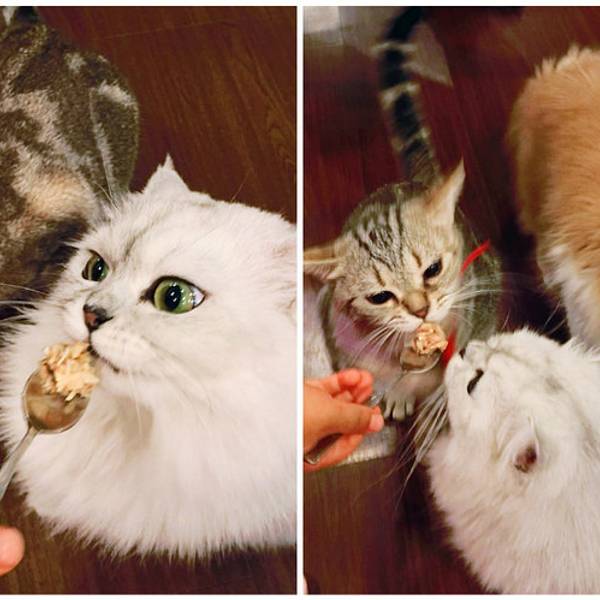 美食对它们来说实在是太贪婪幸福的享受了。 与猫咪们共度一段愉快时光~ 有霸道的直接趴你腿上从碗里吃