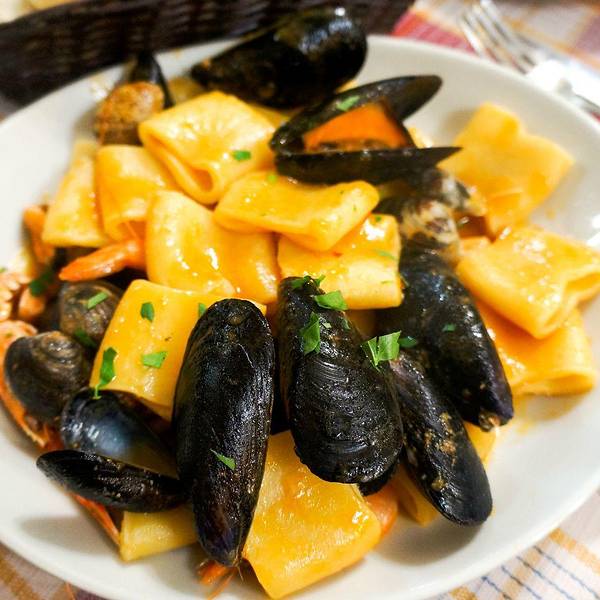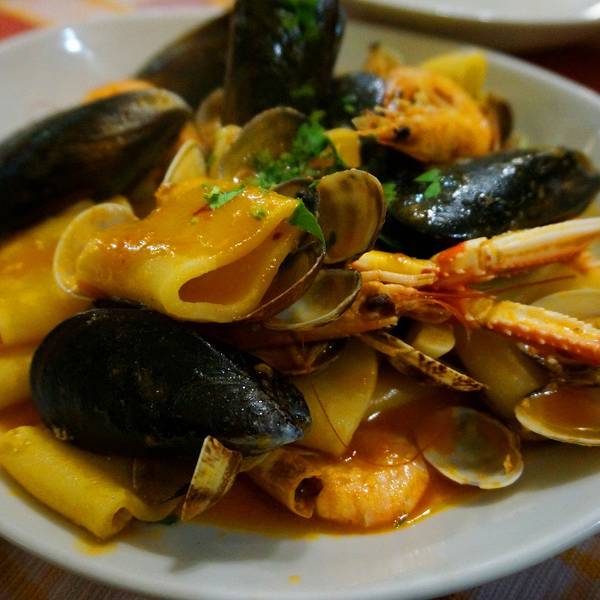 披萨店里面除了美味的意大利当地披萨之外,还有美味的海鲜,特别是墨鱼面,看上去黑黑的一坨,但是真的非常鲜美。而且里面有很多墨鱼的肉条。