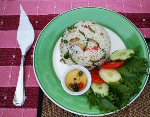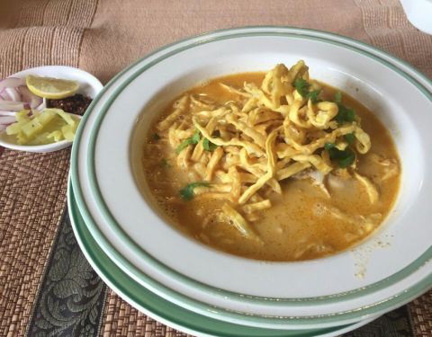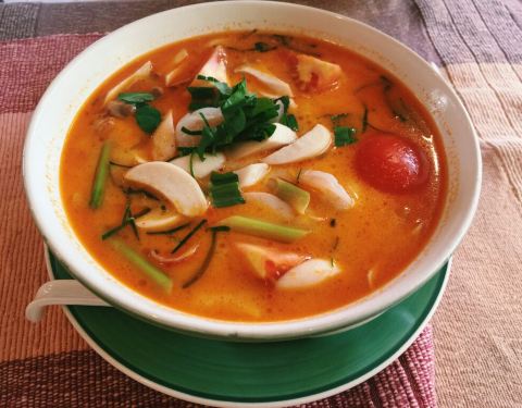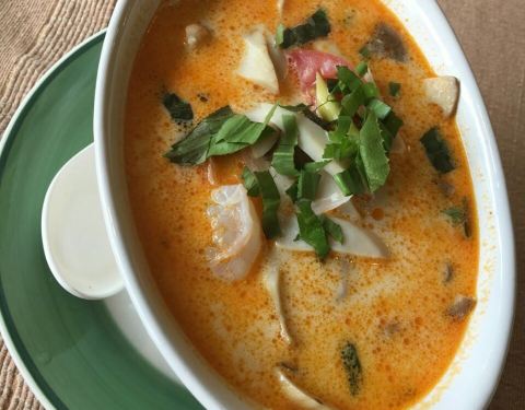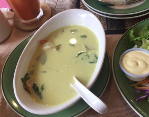 餐厅在清迈古城内,有个独立的小院子,院子里有露天座位,舒适惬意,屋内是美式咖啡店的装潢,非常简约干净。虽然是咖啡店,但有很多食物可选。这里的冬阴功汤很正宗,配了大虾、番茄、蘑菇等,料很足,有淡淡的椰奶味,口感不会太激烈。