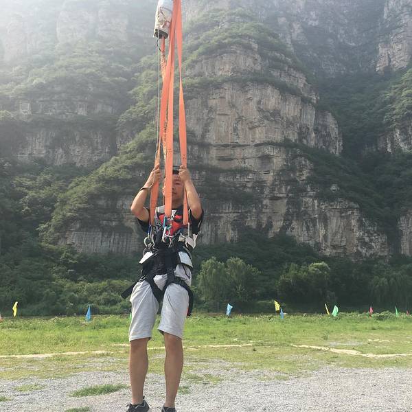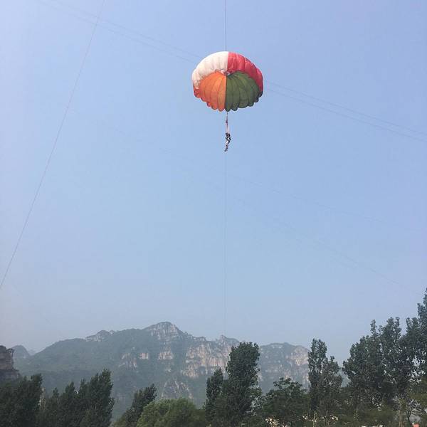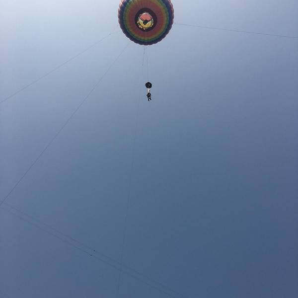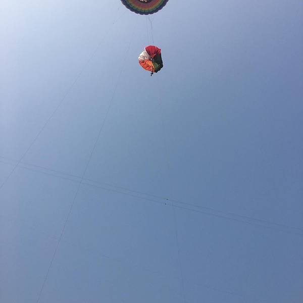 这里倒是人很少,上面飘着一个很大的热气球,会把你拽上去,然后准备跳伞。大概一百多米,是蹦极的两倍