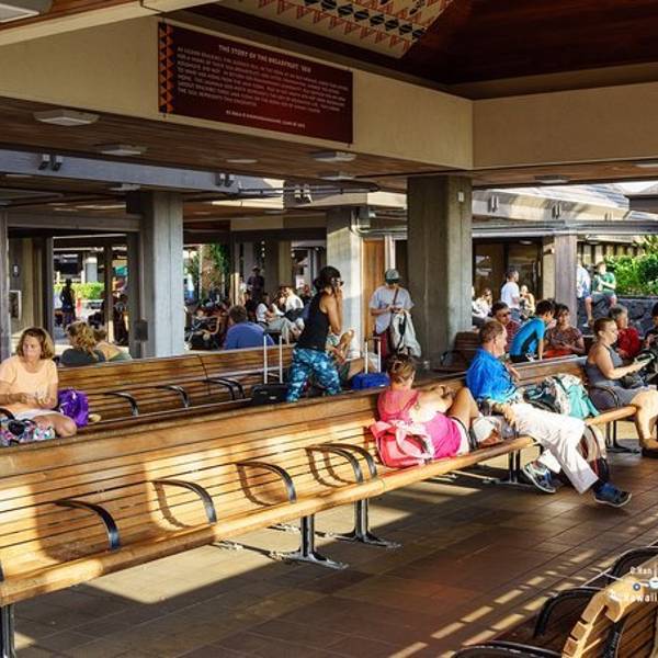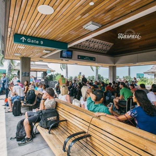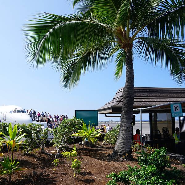 我们住的希尔顿酒店就在西海岸,所以果断订了到科纳机场的航班,一下飞机就感受到了这个岛的与众不同。整个机场非常小,纯木质结构,最神奇的是它竟然是露天的!特别有夏威夷的原始风情。