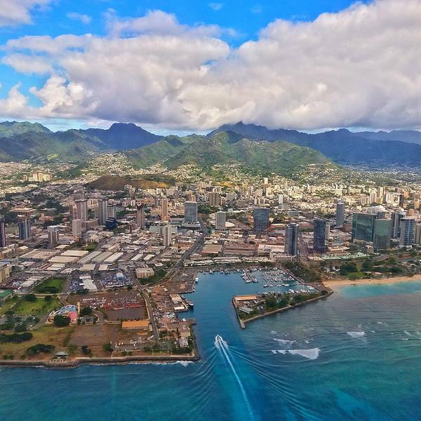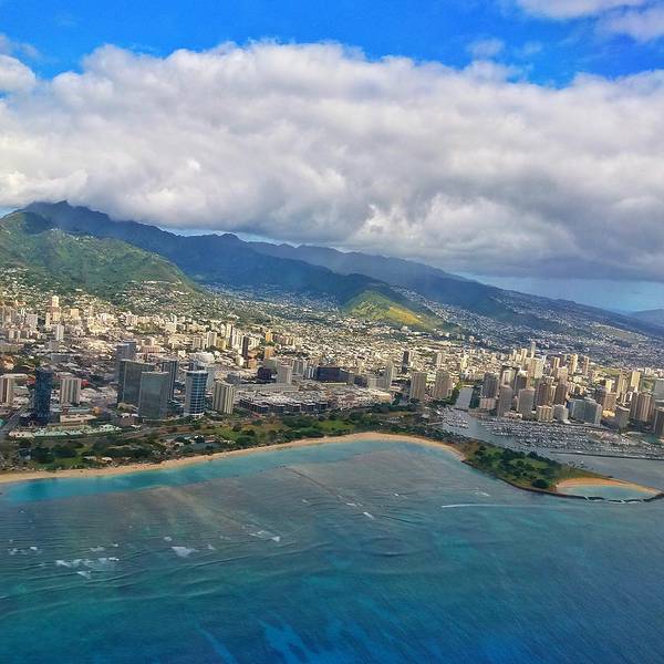 不过可惜小飞机上没有航线图,路过的岛屿有点对不上号,比如这个露出来的火山头,是毛伊吗?这个时候还真是需要有个上知天文下知地理的人在旁边指点一下,比如我爸,哈哈,可惜并没有,老公也坐的比较远,没人解说喽没人解说就自己瞎拍拍,这朵云像不像一只小狗,快跑来我怀里\( ̄︶ ̄)/欧胡的火山口和泻湖看起来很美,但后面密密麻麻的建筑,丝丝压迫感啊有没有。欧胡机场这次来来回回走了三趟,足迹快遍布各个航站楼了,大摇大摆逛商场的海鸥君(还是鸽子?)感觉都很熟悉了哈哈