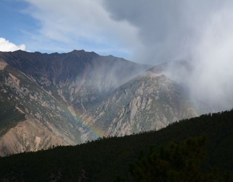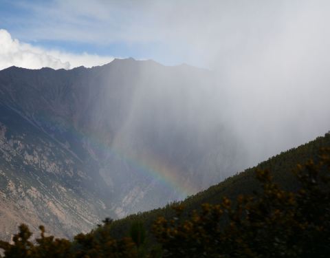 过了东达山后有一座叫觉巴山的大山,海拔高度降下来了,只有近4000米,所以植物就长大了,最运气...从318国道往四川方向走,过了东达山后有一座叫觉巴山的大山,海拔高度降下来了,只有近4000米,所以植物就长大了,最运气的事,下山口时遇上了彩虹,而且是二条,只是拍不好。