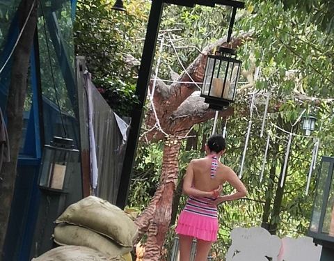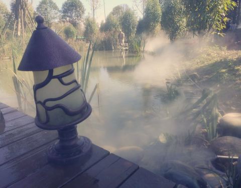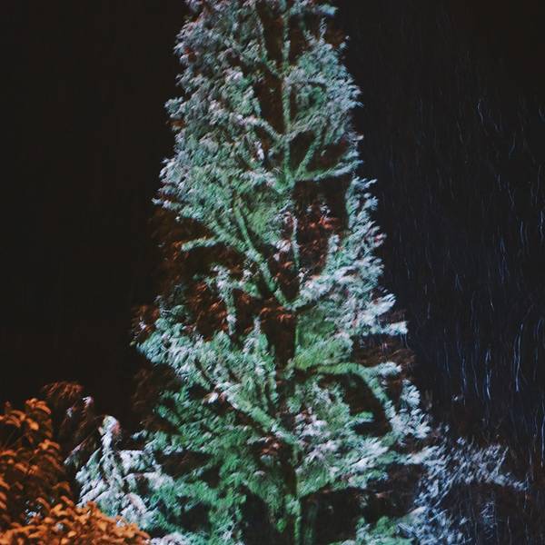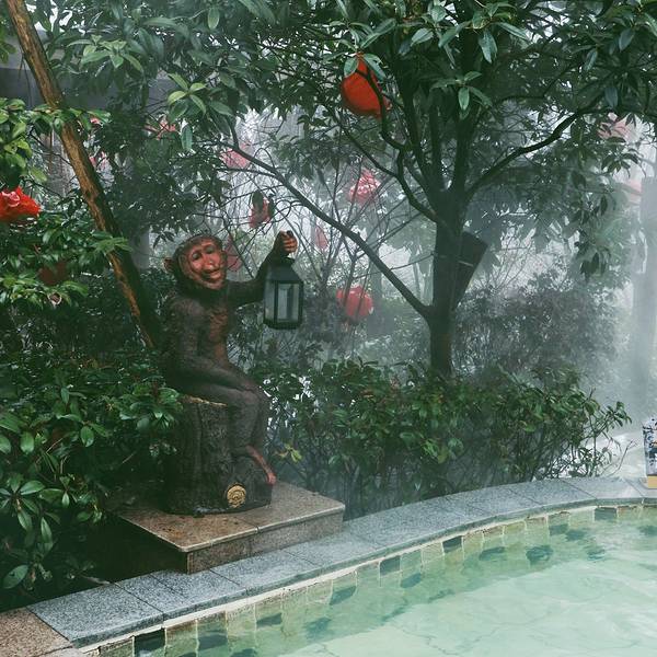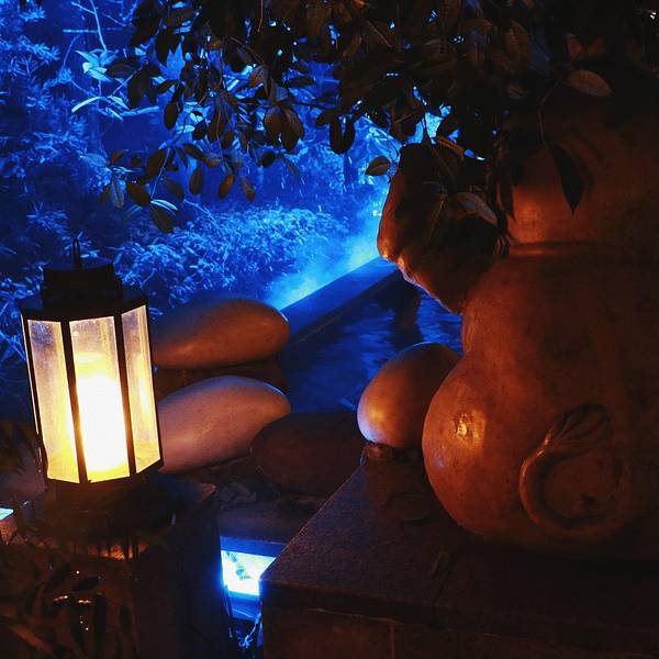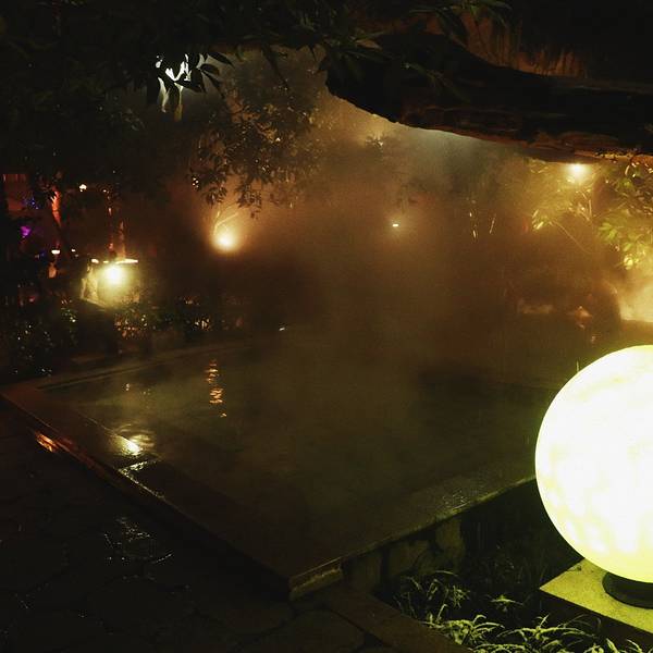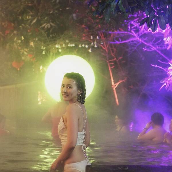 相较于白天敞开式的通透大气,晚上时候一花一草一池一木都在灯光里隐隐绰绰,平添出多种风情。一出换衣间就感受到室外的寒冷,嗷嗷叫着要冲进池子里,却不由得地被门口一颗 大树 和上面的投影吸引住了目光,圣诞树、一池睡莲、旋转木马、飞舞樱花……一棵树和一个投影,却能将人瞬间带回那个快乐很简单的时代。水汽氤氲,灯光在林间显得隐隐绰绰