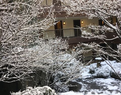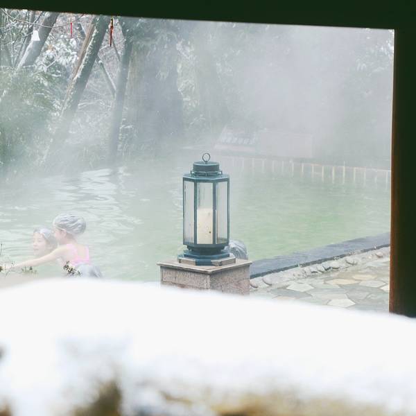温泉分为室内温泉和室外温泉,下雪的日子自然是要体验冰雪温泉才畅快~ 外边冰天雪地皑皑积雪,里面却是水汽氤氲热气腾腾,要不是还有一箱箱的行李放在车里需要先安顿,早就一鼓作气换好衣服先下池子来泡一泡。白天时候的惊鸿一瞥便已觉得心驰神往,到了晚上换好衣服出来的时候却是被眼前之景所惊艳,这才后知后觉“梦幻冰雪温泉”的梦幻之处来。