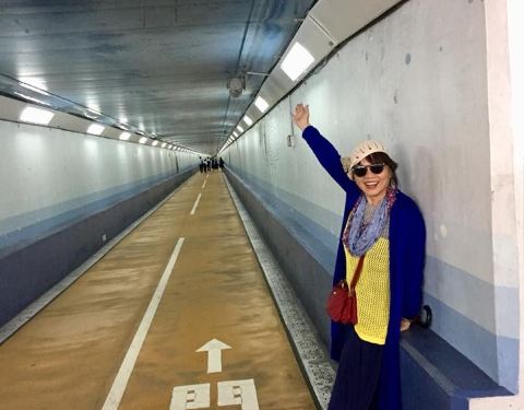 汽车通道的最低部在关门海峡的海面下56公尺, 而行人步道的最低部则在关门海峡的海面下58公尺终于来到关门大桥下了!!!弯弯曲曲的步道便是和布刈观潮散步道。清风徐徐抚过面颊,点点碎阳落在身上,一定要站在这里与你爱的人吹一吹海风。走走停停感觉一点也不累就到了【关门海底隧道人行道入口】