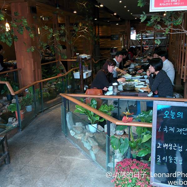 这家是正宗的韩国传统料理。【菜式】分为套餐和单点,建议点套餐,各种小菜都会有。可以选择最基本的,或者水煮白肉套餐,或者红烧排骨套餐,酱蟹套餐等等,还可以选择将米饭升级说传统石锅饭哟。【口味】初到韩国建议水煮白肉套餐,价位适中,如果吃得惯海鲜的话那就直接酱蟹!另外推荐吃石锅饭,将石锅中的米饭挖出,留个底儿,然后倒入热水盖上盖子,等米饭吃完后喝汤^^【价位】价位很适中,套餐从7500韩币到13000韩币,升级石锅饭+3000韩币。【环境】环境非常不错哟,全木风格,意想不到还有室内小溪。。。书架,陶瓷陈列架。多人的话二楼还有雅间 哈哈。【其他】注意桌子上有没有小贴纸,他们家经常会有分享照片送个小饮料什么滴活动。