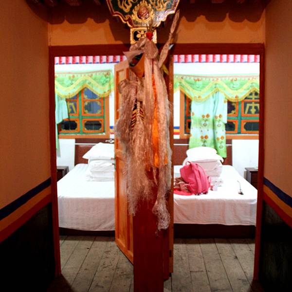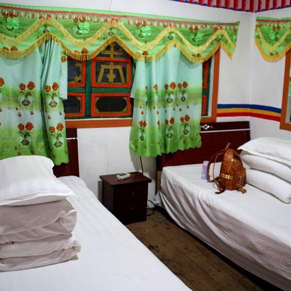住在纯正的藏民农家 两层的小木楼也是藏式风格。木质的二层小楼,有简易的洗手间。不隔音,没有暖气也没有空调和电热毯,地板是木板直接拼凑起来的,还能看到虫蛀的孔洞。但是反而更能体会当地藏民的生活,如果想融入当地,更好的感受藏民家,那么这里还是不错的。