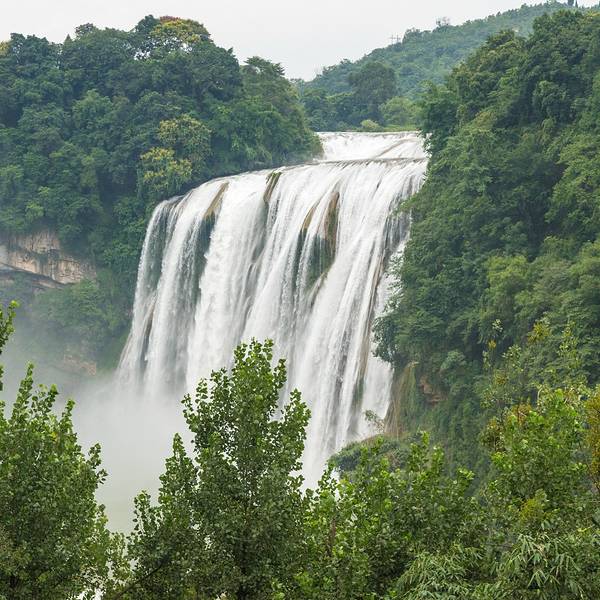 黄果树瀑布高77.8米,宽101米,是亚洲第一大瀑布,游人可从前、后、左、右、上、下六个方位观赏,大瀑布景区内有盆景园、水帘洞、犀牛潭等景观,大瀑雄风、雪映川霞、银雨洒金街、水帘摸瀑等自然奇观给黄果树瀑布平添了许多神韵。公元1638年,明代地理学家、旅行家徐霞客到此游历,对大瀑布作了精彩的描述:“捣珠崩玉,飞沫反涌,如烟雾腾空,势甚雄厉”,“盖余所见瀑布,高峻数倍者有之,而从无此阔而大者”。清康熙36年(公元1697年)文字记载称“白水河瀑布”。清道光年间刻印的山阳李宗邡《黔记》中,收录了江西山阳李腾华的《白水河小憩并序》,其中写道:“白水河,其地多黄果树,故以树名名村市。”,序中还引用了两句诗:“飞雪溅衣黄果树,乱红撩眼刺梨花。”,故大瀑布亦名“黄果树瀑布”。
