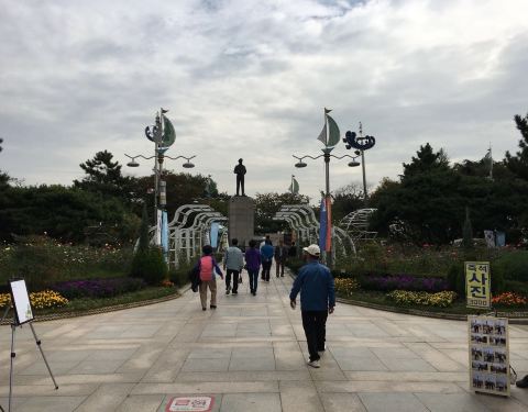 很漂亮一个公园 里面很多的花 开的正盛 有麦克阿瑟将军雕像 麦克阿瑟 对韩国人来说 是绝对的英雄 尽管战绩不算太好 这里是高点 可以看仁川港