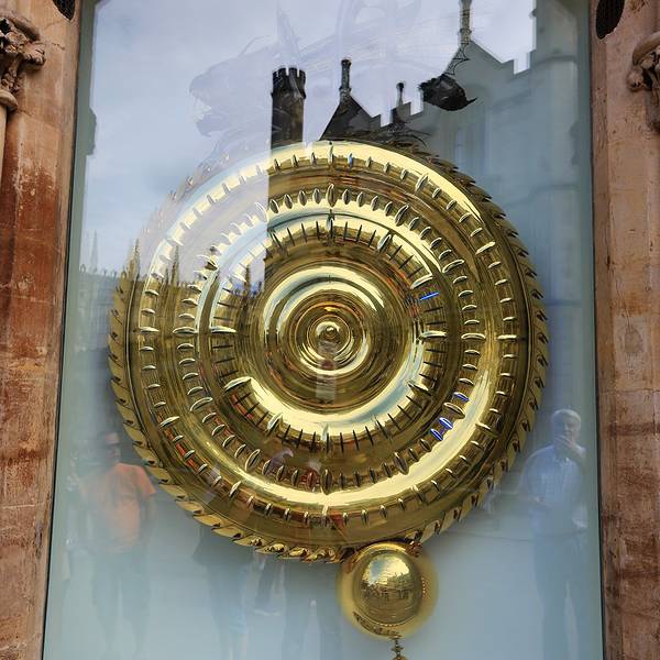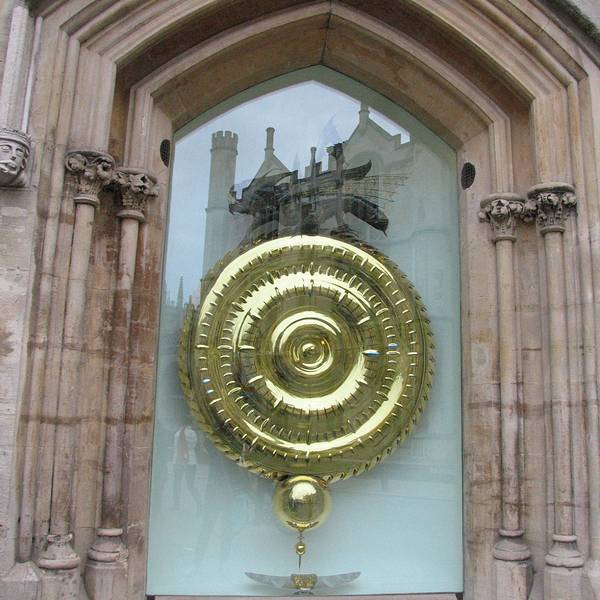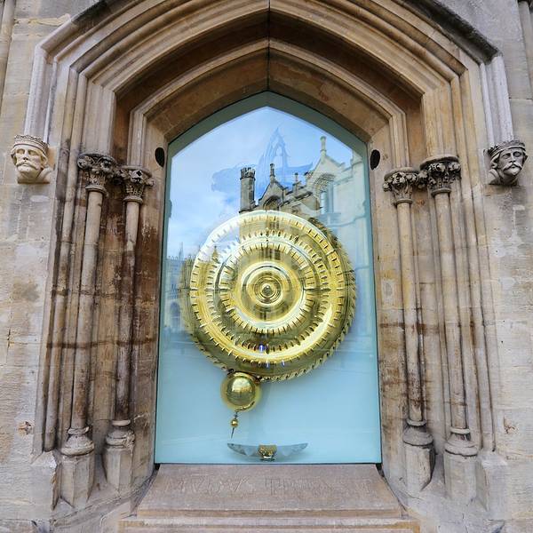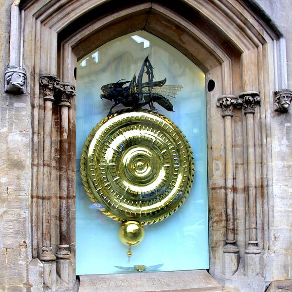 2008 年的夏天,剑桥市中心国王学院大门正对面,Corpus Christi 学院图书馆外墙上突然惊现了一个造型诡异的大钟。一只模样十分邪恶的蚱蜢趴在一个豪华的金色大钟上不停晃动,每到第 59 秒的时候,便一口把时间吞下。