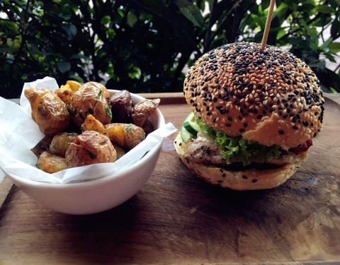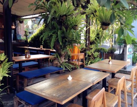 绿树掩映中的一家餐厅,将巴厘岛和西式美食结合。烤鱼食材新鲜,味道非常鲜美,配菜更有甜丝丝的烤玉米。烤猪肉香甜酥脆,配上含有芥末的酱料,入口层次分明。鱼肉汉堡美味多汁,搭配的油炸小土豆更是软糯停不了口。这里还提供多种口味的康普茶,营养又健康。
