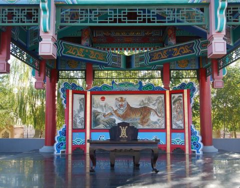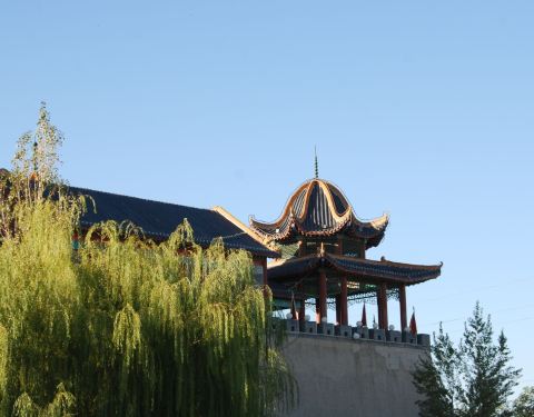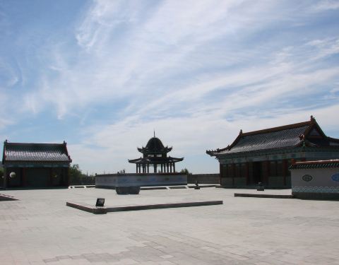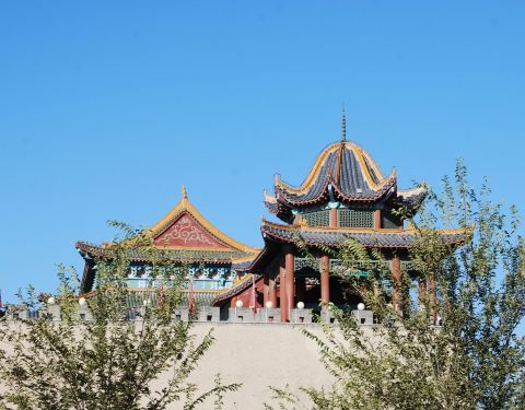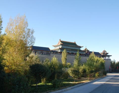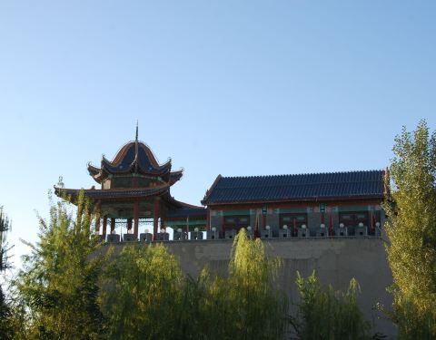 回王府位于哈密市区南端,从市区乘坐公交车便可到达。回王府曾是新疆规模大、建筑宏伟、风格独特的一座宫廷建筑,是名副其实的“西域小故宫”。如今的回王府是以曾经的回王府为原型重建的仿古建筑群,在这里可以感受到曾经回王府的雄伟精致,参观汉族文化与伊斯兰文化结合的建筑风格,了解哈密在回王统治时期的历史。回王府的大门位于北侧,整个王府面积不大,长宽都大约两三百米,步行游览即可,大约一到两个小时就能逛完。园内一共有28座建筑,主要分为三个部分,分别是庭院、点兵台和王爷台。从景区北侧的大门进入后,映入眼帘的是景区中心的一条马路,建筑都分布在路边,进门后左手边便是庭院区域,这里是一个长宽大约30米左右的四合院,也是曾经王府接待宾客的驿站,这里的建筑与一般的中式四合院区别不大,可以简单参观一下。沿着大道向前约60米便来到了王爷台区域的入口,入口在右手边。王爷台是景区里主要和最大的部分,也是当年回王办公、礼拜和居住的所在地。王爷台是一个长宽约有100米的大院子,有办公大殿、回王寝宫、清真寺等建筑,办公大殿地势较高,爬上大约几十级台阶到达大殿后便能俯瞰景区内的建筑。当初回王修建这里时是仿造故宫的建筑建设的,又加入了伊斯兰的风格,所以里面的建筑都很有特色。首先是清真寺,寺的大殿是典型的汉式建筑,而宣礼楼却是伊斯兰的圆拱尖顶建筑,反差很大。参观院落时还要注意一下,在院落亭台内看不到任何的动物和人物的雕像,只有花草和各种几何图案,这也是伊斯兰教的风格,很有特色。在办公大殿和寝宫内还陈列了当年回王的办公设施、生活用具等情况,也有历代回王的画像和说明,可以在参观时了解历代回王的历史和故事。游览完王爷台附近的景点后一直向东走便可以来到点兵台区域,有练兵场、高高的岗楼、营房等建筑,可以进去参观一下。参观完王爷台后便可再沿着景区中间的大道向北返回大门口离开景区。