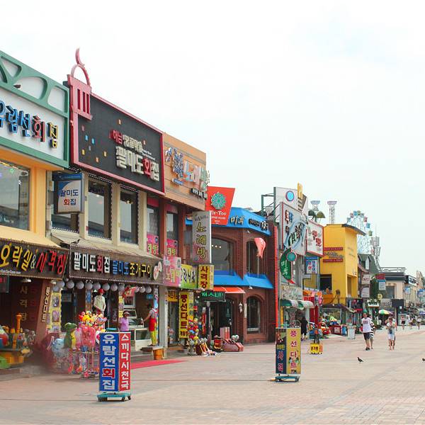 月尾岛文化街(월미 문화의 거리)位于海边,是一个综合文化长廊。整条文化街沿着海岸线不断延伸,一边是富有情调的咖啡店和美食店,另一边则是风光无限的大海。