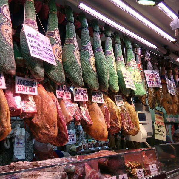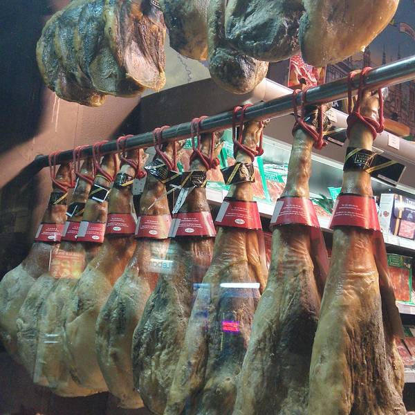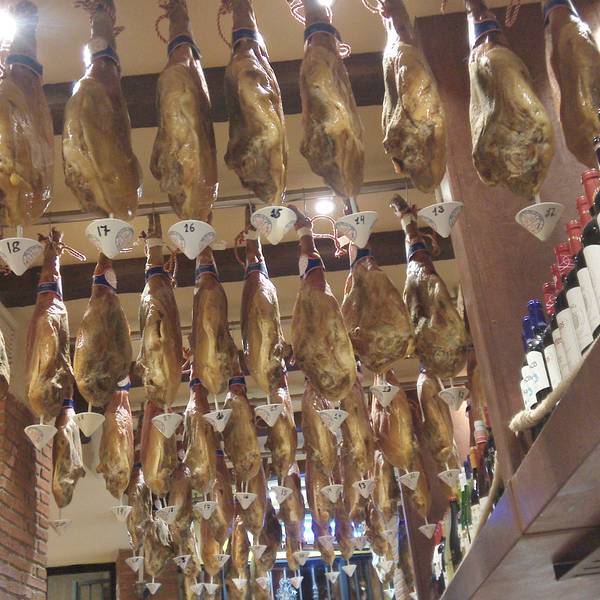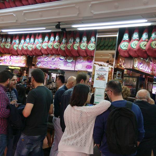 结果呢,这晚好像一共去了六个不同的地方,每个地方都是点两杯啤酒,加一份小吃。在第一个华人开的餐厅里品尝了西班牙海鲜饭,味道真不错;然后去了第二家是一家非常传统,看起来装修地像上海第一、第二食品商店一样的地方,在格兰大道会看到不少这样的店。吧台在整个饭店的最中间,人声鼎沸地围绕着吧台,想要点单只能挤进去,点完了要么在吧台旁边喝,要么拿出来到角落也有一圈小桌子。我想这就是一种文化,西班牙人可能特别喜欢这种热热闹闹看起来没有任何隐私,但又和自己的朋友结成小圈,融入其中的氛围。就像拉萨的甜茶馆,爱尔兰的酒吧区,你是也可以选择在家里喝茶,在包间里小酌,但总会觉得少了那么一点什么气氛吧。还有就是这家小吧周围全部挂满了火腿,我粗粗数了一下大概也有上千只,国粹啊国粹! 后来又在La Latina随便挑了几家去吃,开始吃到免费的Tapas了,基本上每次点两杯啤酒,都会赠送免费的小吃,有一家是送油浸橄榄、土豆拉沙和酸菜萝卜之类、还有一家赠送了很好吃的西班牙土豆饼、和一些不同口味的三明治,总之免费的总是让人心情愉悦的,不知不觉可能比正经吃一顿饭吃的还要多了。