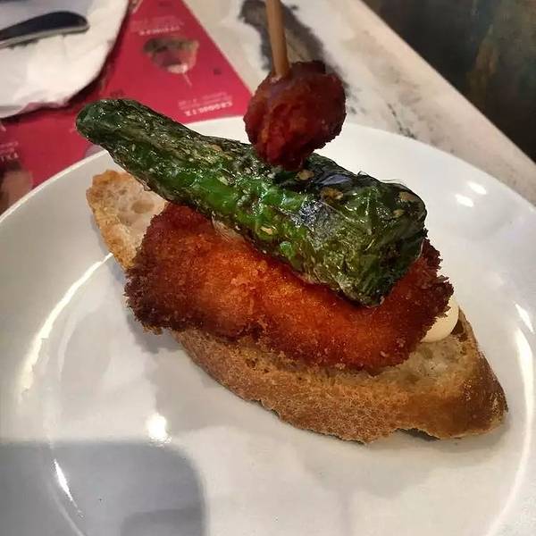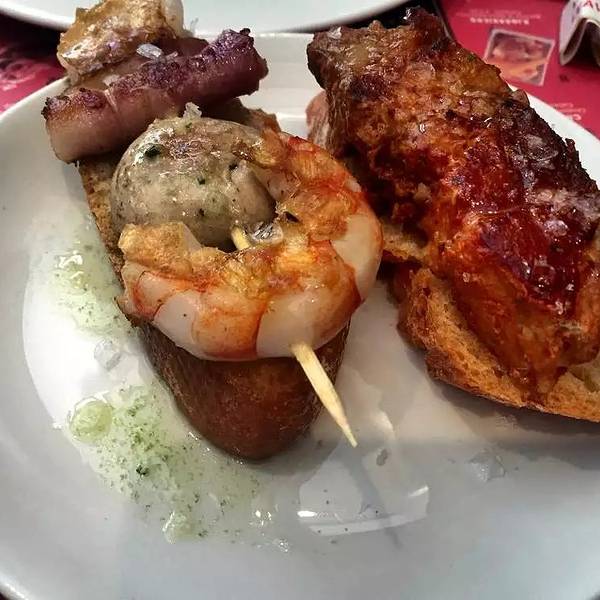 西班牙有名的小吃“tapas",在西班牙随处可见,几乎大餐厅和小馆子都有,面包上面放一点小菜