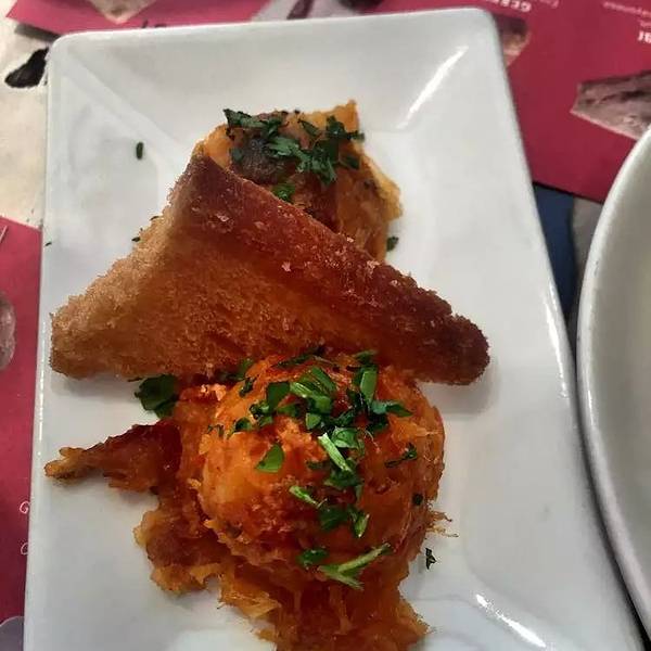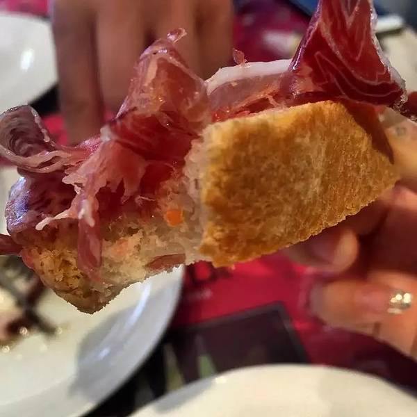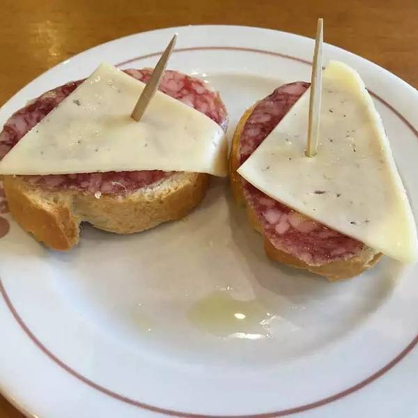 西班牙有名的小吃“tapas",在西班牙随处可见,几乎大餐厅和小馆子都有,面包上面放一点小菜。味道还是很不错的。吃带有火腿的会觉得有点咸。
