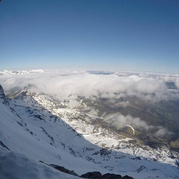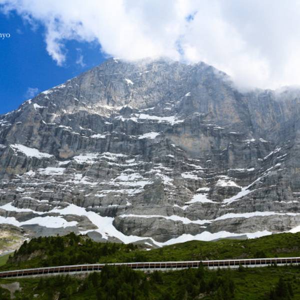 (艾格峰上的云层要在夕阳西下时分才会渐渐散去)(艾格峰的北壁,下面的铁路都装备了防护雪崩的顶棚)