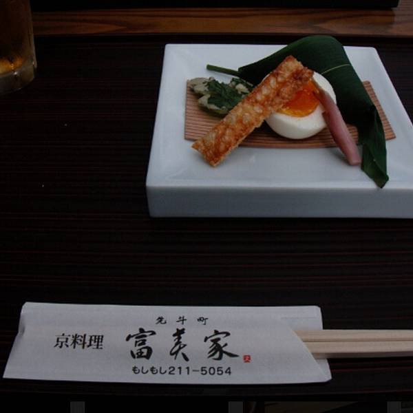 京都挺有名的“京料理”店,夏天这里会有很特色的川床,面向压船席地打地铺而坐,吹着和风感觉很惬意,在酒店的协助下预定的这间酒店。位置在河源町木屋町走通的北侧,三条站再往东北一点就到了,不是很好找,得依靠国外的地图软件。晚餐我选的8500日元一人份的套餐,两人起预约。 里面先上的是水果子,车厘子配一小牙哈密花,哈密瓜在日本可是天价,甜美新鲜。三文鱼和乌贼刺身非常好,三文鱼新鲜入口稍微嚼就化了,乌贼很有嚼劲。小菜的话有个芦笋虾仁印象不错,芦笋鲜嫩,虾貌似炸过是微脆的;还有溏心蛋,流动感没那么强,蛋黄好香真非国内“洋鸡蛋”可以比啊!餐后会上个大虾味噌汤。总体感觉单品分量都很少,但我这男士也吃很饱了。提示餐厅有2层,景观位全部在2层
