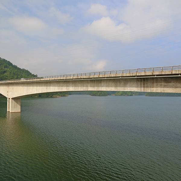 小金山大桥是淳开公路的关键控制性工程。该桥全长440米,宽12米,最大跨度达200米。大桥上部结构为预应力砼连续钢构,下部构造通航孔主墩均采用双薄壁结构。由于大桥所处湖面水深近60米,大直径深水嵌岩桩的施工难度极大,因此在同类桥梁中堪称世界罕见,被称为“国内第一桩”,其桥梁的跨度在我省也属第二跨。