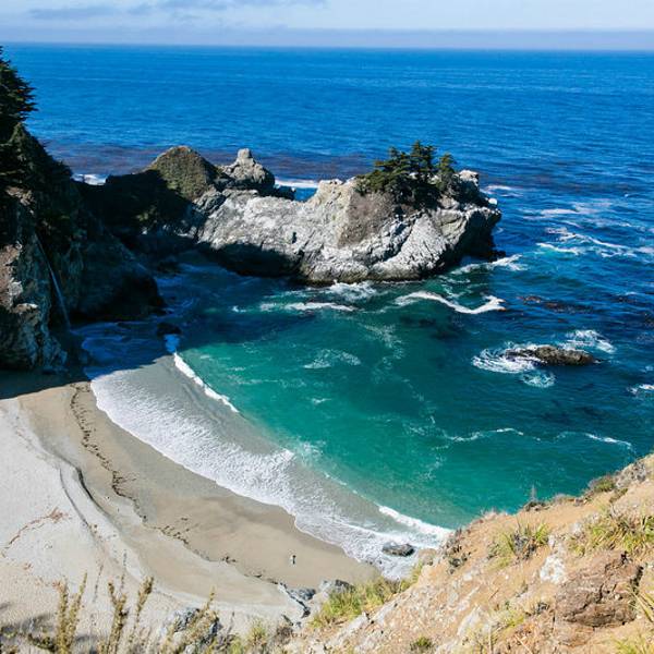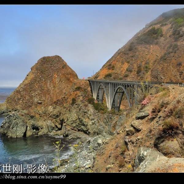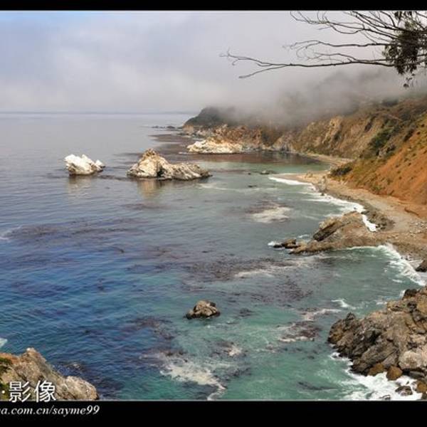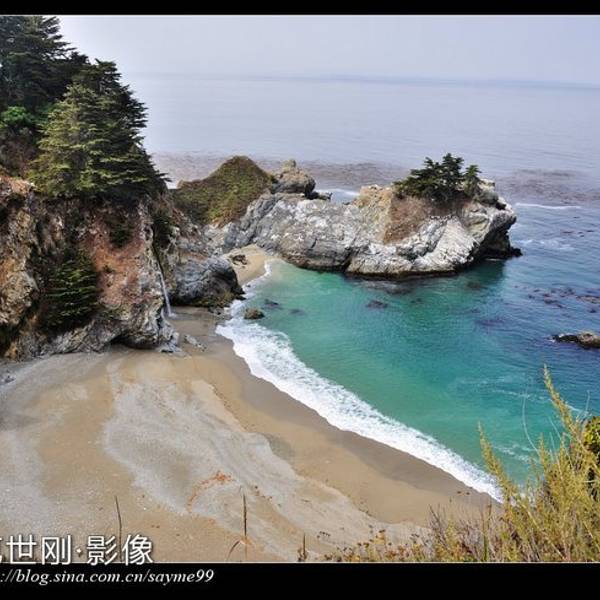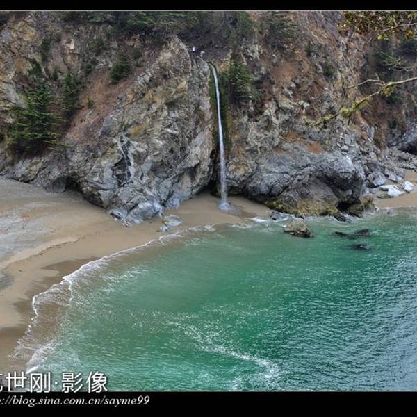 Julia preiffer burns state park 这个公园被公路分开了,一边是公园,一边就是有名的海边瀑布McWay falls。在公园停车场停下,收费需要自助服务,即填好一张二联表,将一联放在车内,另外一联和USD10元放入收费箱,然后穿过马路下面的隧道,很快就到了观景点。看到左边阴处的瀑布吗? 现在是枯水期,不知道丰水期水量如何,据说是世界上唯一的直接注入大海