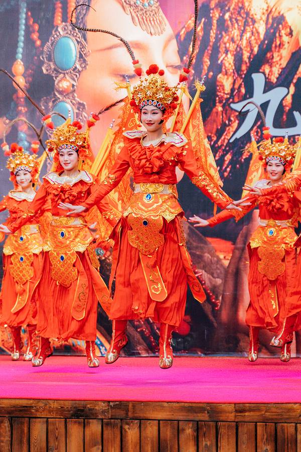 在景区内能够看到精彩的藏羌歌舞和抛彩球、藏族傩戏等演出。核心项目大型歌舞《九寨千古情》是一场极度震撼的视觉盛宴。演出分为《藏密》、《古羌战歌》、《汉藏和亲》、《大爱无疆》、《九寨传说》、《天地吉祥》等场。