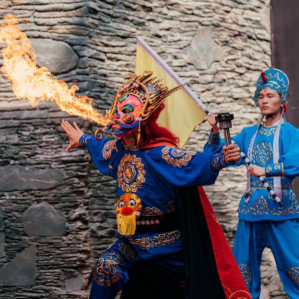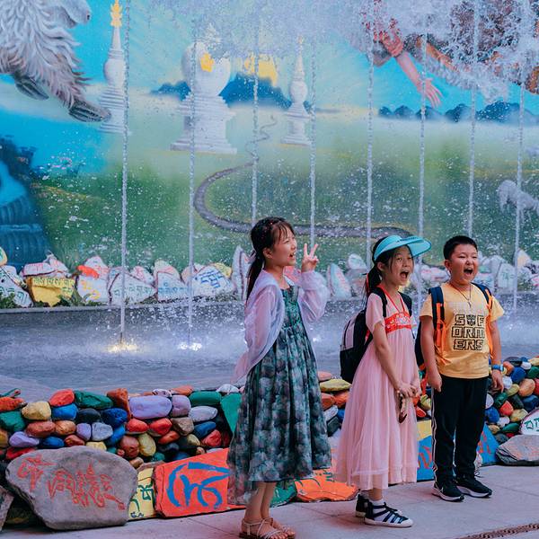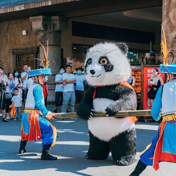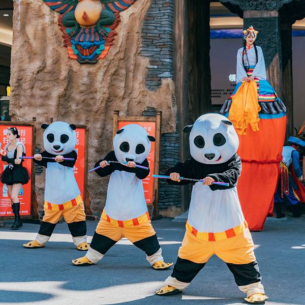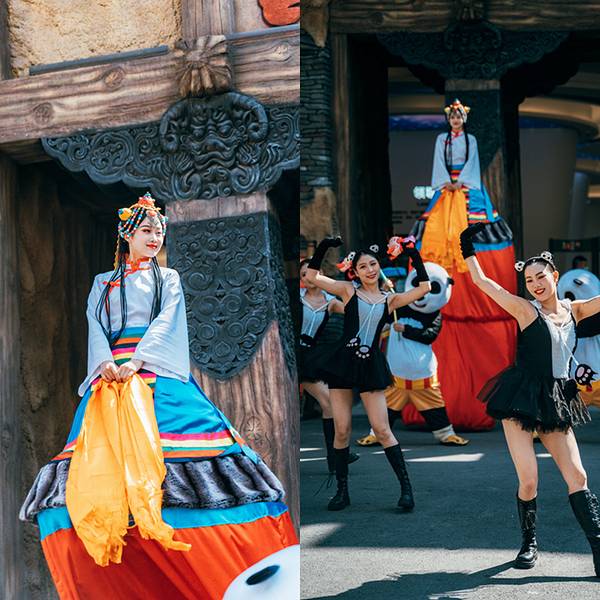九寨千古情景区距离九寨沟景区七公里左右,交通方便,且周边配套相当完善。要不是抬头看到的大山,否则完全让人忘记了是在川西。景区每天下午在开门的时候会有一场盛大的欢迎仪式,迎宾不倒翁小姐姐和功夫熊猫的表演非常引人瞩目,现场的气氛一下子热闹了起来。进入景区,首先映入眼帘的就是“幸福的呐喊”。幸福的呐喊就是声控喷泉,大家的分贝越大,喷泉的水柱越高,引得不少小朋友们跃跃欲试。参加比赛还可以获得小姐姐们赠送的一枚可爱的贴纸。虽然重头戏是《九寨千古情》,但其实景区里面的表演不断档,藏族小哥的一首《神奇的九寨》高亢豪迈,回味悠长。而万万没想到,在景区内居然还能看到川剧绝活“变脸”!