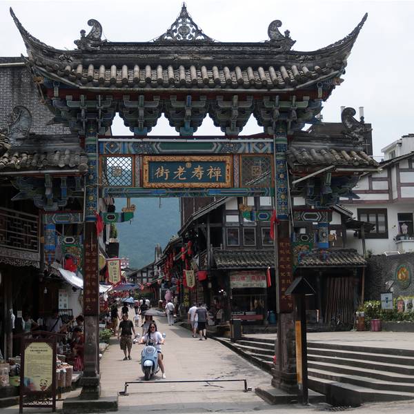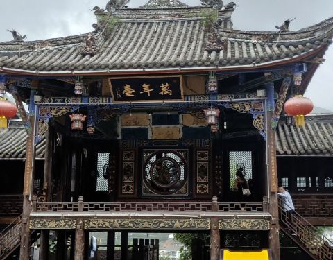 建筑平面凸字形分布,歇山顶,穿斗抬梁式结构,七架九脊檩,素筒瓦屋面,灰塑脊,顶施藻井,并有彩绘。具有古朴典雅的民族特色和地方艺术风格,吸取了中国传统建筑及川西民居建筑结构的简洁、朴实、庄重等特点,是研究中国戏剧发展史宝贵的实物资料。卖蜂蜜的老者,古街随拍。古镇随拍如没标注清楚,真不知这是二师兄。古祥富贵,这是大众的愿望。古街就几百米,早在商代就享有 “长寿之乡” 的美誉,时称老人村,重建后现称之为禅寿老街。想在这里过一晚,看看古镇夜色,不过包吃包住80元/人你也是看看就算了,别当真。不过不是真的你写出来干嘛呢。算了,走吧。车回都江堰,找宾馆住下,早休息。