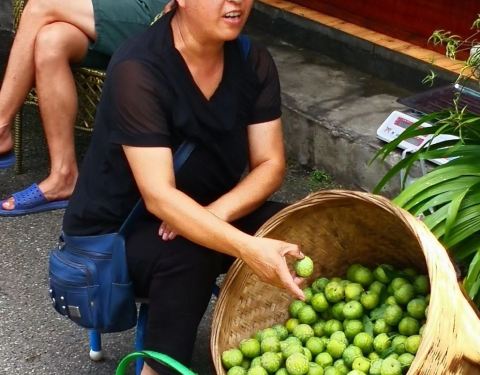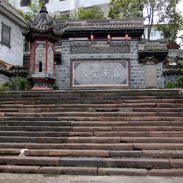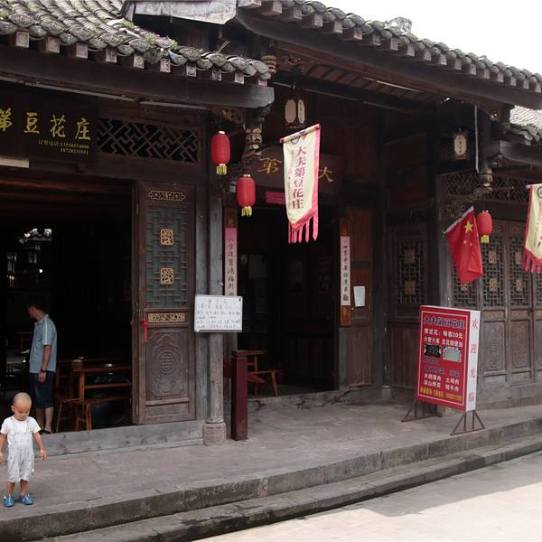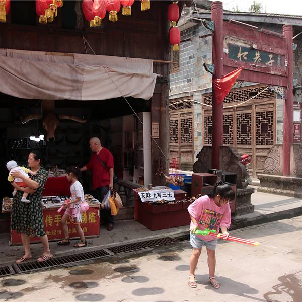不过差不多回到成都平原,海拔低了,也热了不少,从镇外车站走到镇内,一头汗,还没看到古镇的样子,后来看到这一个木房子,算了从这里上去看看是什么回事。原来这个古镇是建在半山上,木房子的另一边就是这个戏台,俺就是从这戏台底下钻上来的。