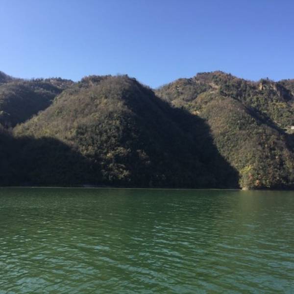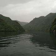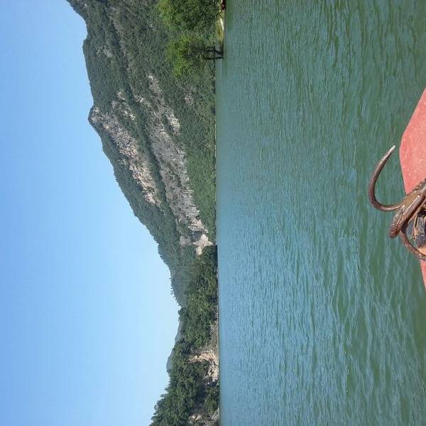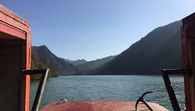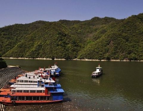 身在船中,仰望两岸,像这种长江三峡造型的景点还有几处,难怪这里被称作“小三峡”到了南河大坝上,只见南河被水库大坝拦住后变宽了很多,两岸青山环绕,林木葳蕤,河水碧波荡漾,水深难测,恰似长江三峡“高峡出平湖”的样子。 岸上的柿子树倒映在水中,河边一群鸭子悠闲地在树荫下觅食。两岸...到了南河大坝上,只见南河被水库大坝拦住后变宽了很多,两岸青山环绕,林木葳蕤,河水碧波荡漾,水深难测,恰似长江三峡“高峡出平湖”的样子。 岸上的柿子树倒映在水中,河边一群鸭子悠闲地在树荫下觅食。两岸青山排闼而出,小船在水面往来穿梭,有的船家还唱着山歌。一条船升起灰色的船帆,顺风而下其势张扬。船家边划船边讲解,给我们讲述当地的典故。前面一座山上,一块巨石生于其上,像是一个天然石桌,旁边还有些石块像石凳,船家说这叫“读书台”,相传周文王隐居于此时,这里是他每天读书的地方。转过一个山弯,只见两侧山峰石壁高耸,垂直陡峭,一些岩石呈长条状倒挂于巉岩之上,船家说这是“牛肝马肺峡”,其形状很像长江三峡的“牛肝马肺峡”。身在船中,仰望两岸,像这种长江三峡造型的景点还有几处,难怪这里被称作“小三峡”。 展开