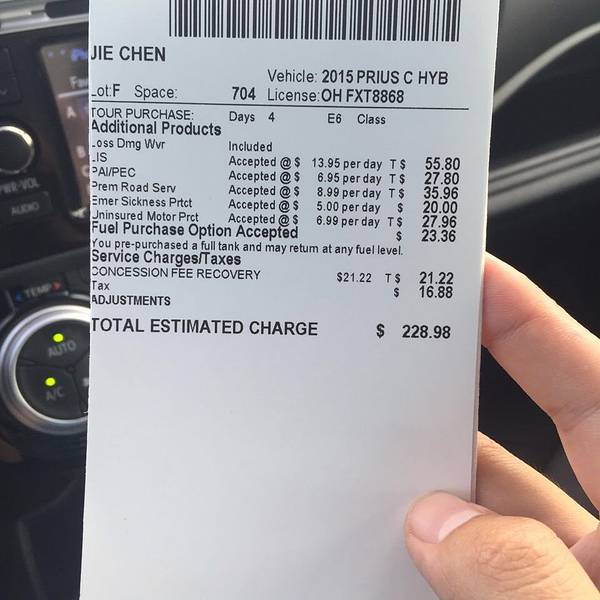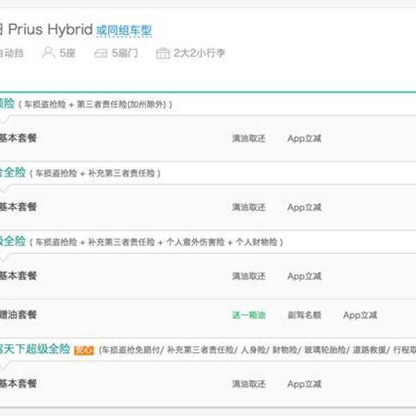 我是之前通过惠租车的网站,进行预订的,可以通过输入取车城市和换车城市来确定取租车的门店和时间,之后选择相应车型和险种,一般上来讲异地还车会增加费用,机场取换车也会增加费用,7天和14天的租车期是一个比较好的优惠期。我这次选择的是丰田的混合动力的车型,后几天的体验告诉我之前的选择是正确的,除了取车时候送的一箱油外,我只花了20刀的油钱,加了一箱多一点的汽油,非常省油。