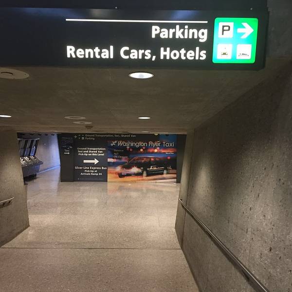 最快速度的离开机场,坐着Hertz的免费摆渡大巴车来到了租车公司的提车点,话说Hertz的服务相当不错,黑人司机大叔还帮忙把行李拿上拿下的,很是贴心,车行五分钟左右就到了Hert...杜勒斯机场去往租车点的方向指示牌