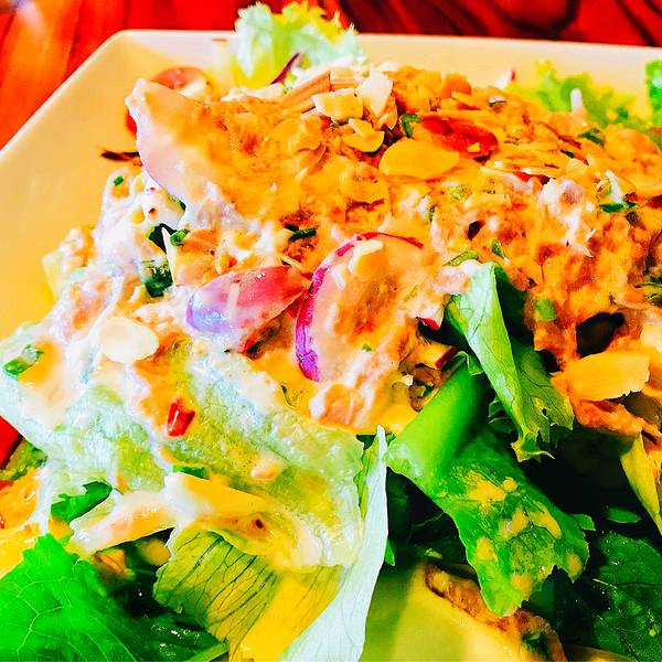 日落前,友人神秘地说今天要带我去一个原生态有机农场,吃一顿super size的晚餐,还再三提醒我点一款要两个人吃,我心里面想“这super size”似乎有点过了把,毕竟在国外这么多顿分量都一般般,加上我又是大胃王,难道我吃不下?带着这种疑惑驾车来到OHKAJHU,引入眼帘的是超级有特色的门外装修,大门口停着一台Organic coffee bus,车辆外形装修,可爱又生动。往里面参观了下,放眼去全是一片绿,在这样的环境下品尝着农场自己种植的绿色蔬果,感觉特别放心安全,据说餐厅老板创立这家餐厅目的就是为了保障无添加绿色出品,结果这样的餐厅一出现,引来许多当地人追捧喜爱,不到五点店内就排满了人,我们稍等片刻拿到二楼的位置,赶紧往上走,一尝健康美味!往里面参观了下,放眼去全是一片绿,在这样的环境下品尝着农场自己种植的绿色蔬果,感觉特别放心安全,据说餐厅老板创立这家餐厅目的就是为了保障无添加绿色出品,结果这样的餐厅一出现,引来许多当地人追捧喜爱,不到五点店内就排满了人,我们稍等片刻拿到二楼的位置,赶紧往上走,一尝健康美味!OHKAJHU地址:Thailand,Chiang Mai,Nim city Daily,197,199/8 Mahidol Road