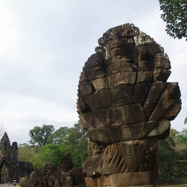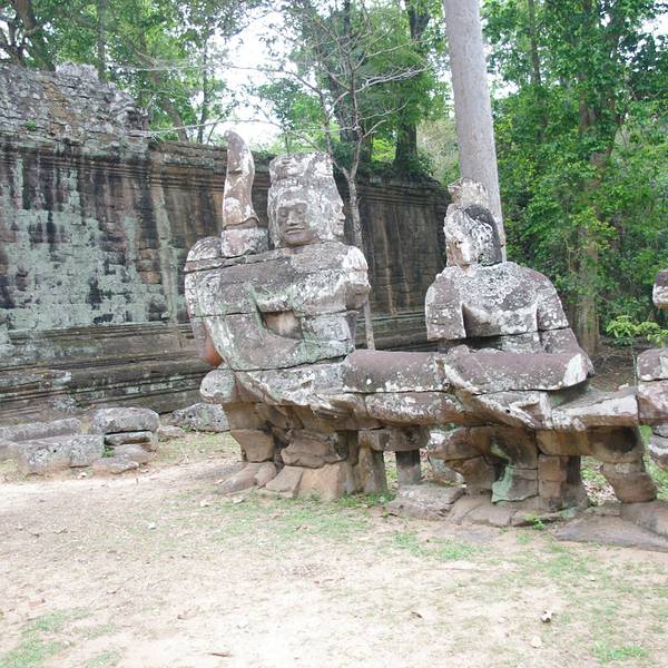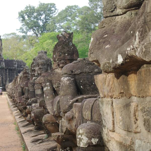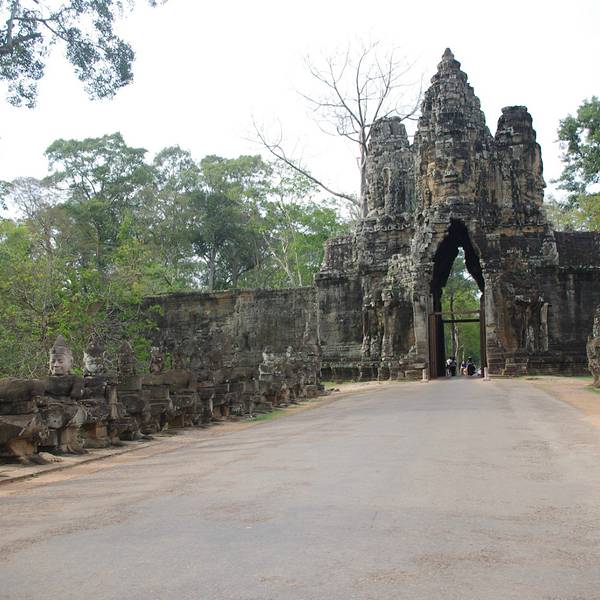 吴哥王城东门、吴哥王城北门、吴哥王城南门、吴哥王城胜利门、吴哥王城西门五处城门中,吴哥王城南门和吴哥王城胜利门最引人注目,两侧是巨幅搅动牛奶海的浮雕,每扇高耸的城门上都有观世音菩萨的巨幅头像凝视着...