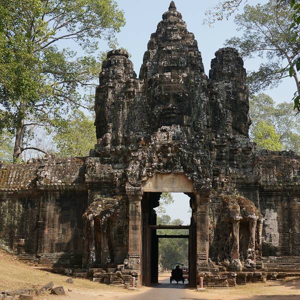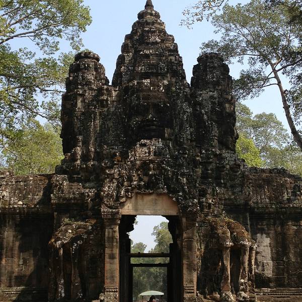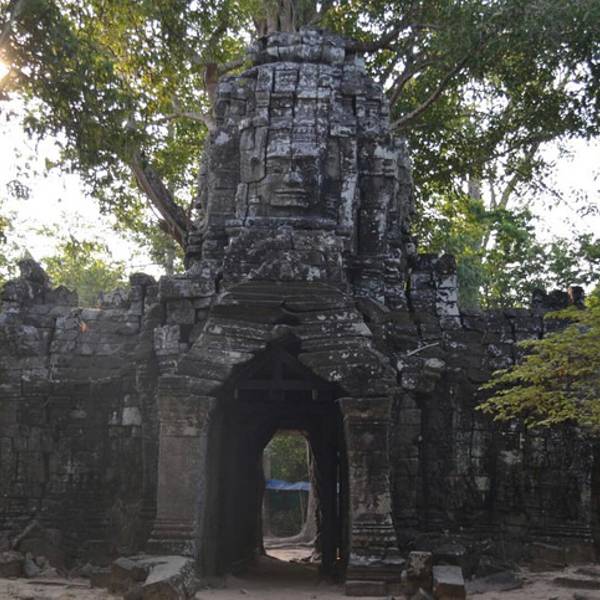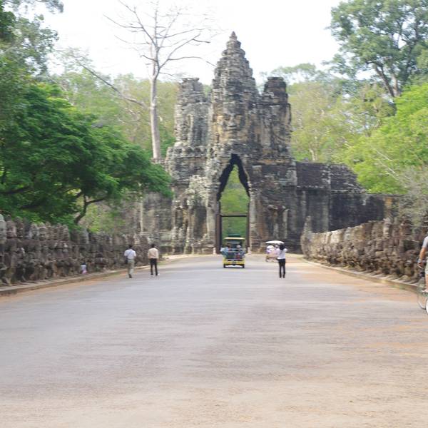 暹粒全城一共有5道城门,南门和北门是百姓日常通行之门,东门为出丧使用,西门是犯罪者所走的。东门北侧还有一道胜利门,直通王宫,是国王专用。南门城门高达23米,上方为巨大的四面佛像,面露安详的微笑,是吴哥古迹的标志之一。 城门作为古代遗迹之一,很有值得一看的价值。