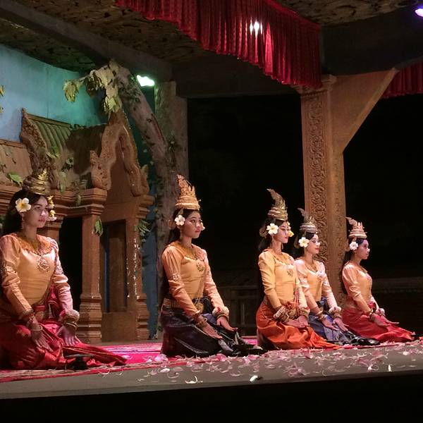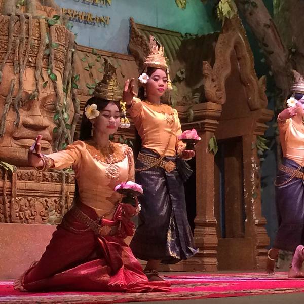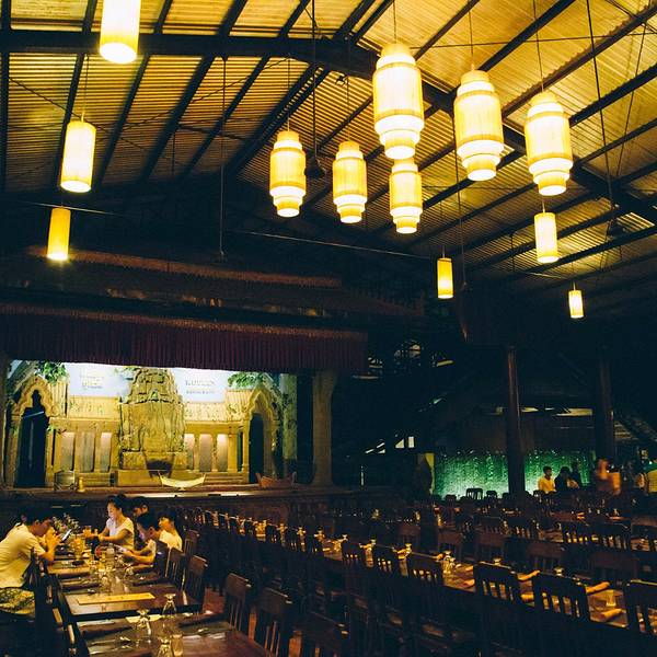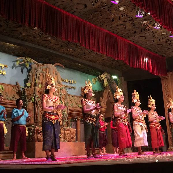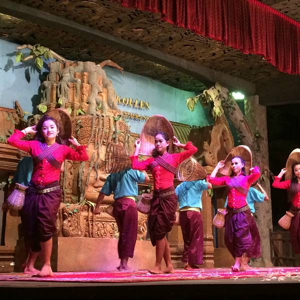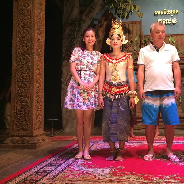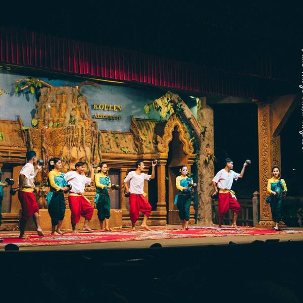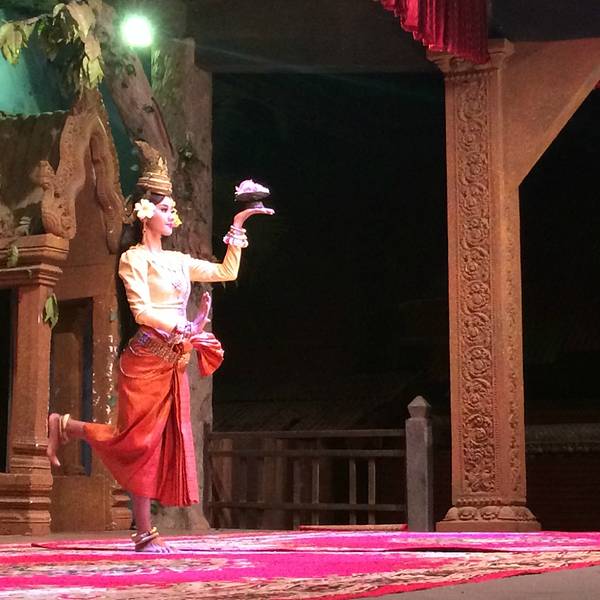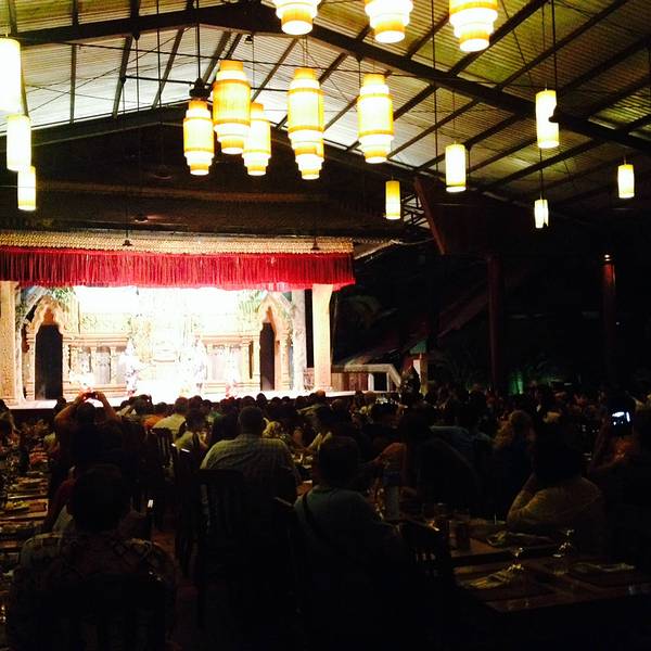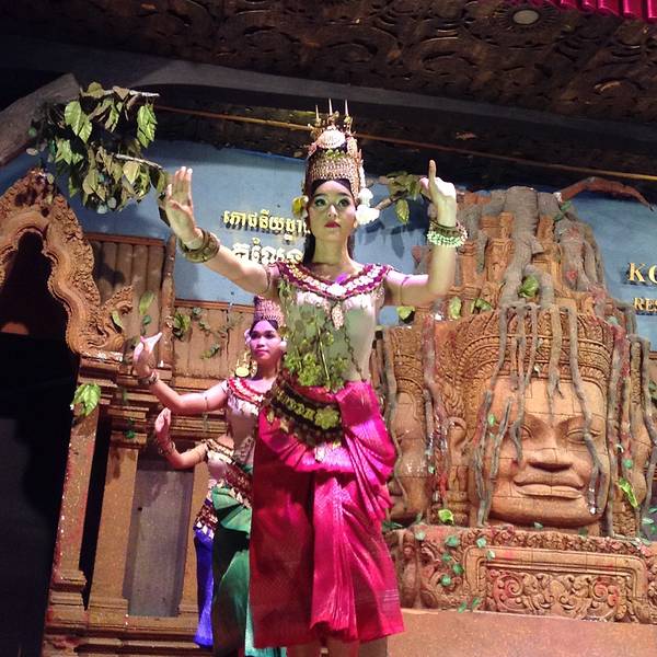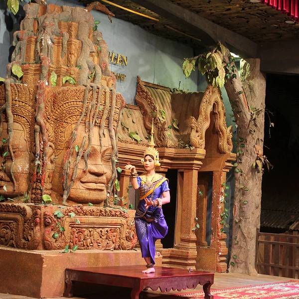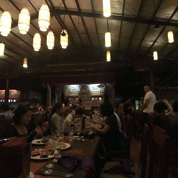 但是想到要赶场,就赶紧撤了,去这个在某程上订的餐厅。主要是冲它有柬埔寨歌舞表演和传统美食。跟吴哥的微笑表演比起来,听说那个是张艺谋导演的,想了想还是希望看到本土的表演。Pete知道我要去这里,问我是否...但是想到要赶场,就赶紧撤了,去这个在某程上订的餐厅。主要是冲它有柬埔寨歌舞表演和传统美食。跟吴哥的微笑表演比起来,听说那个是张艺谋导演的,想了想还是希望看到本土的表演。Pete知道我要去这里,问我是否订好了位置,说非常多人。等看完日落到了那里,快七点,表演是7点半开始,应该是某旅行团跟我们留了两个位置,还好比较靠前。吃着吃着,惊奇的发现偌大的餐厅竟然是人满为患,感觉暹粒所有的老外都集中过来了,欧美脸,日韩腔,天啊惊呆了这里到底有多少老外,虽然我也是他们其中一个。