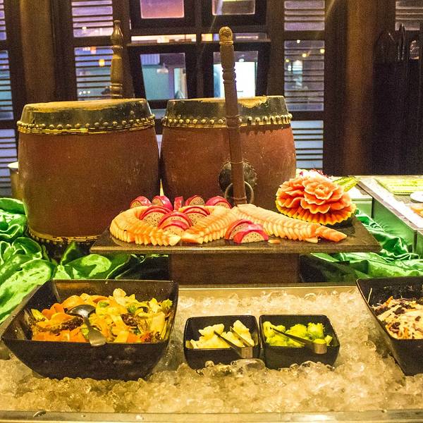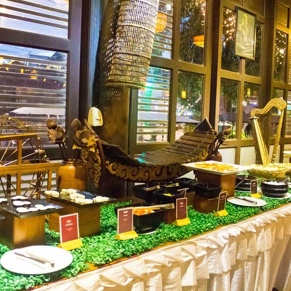 很热闹的餐厅,那里用餐还可以看表演,食物很赞,选择的东西很多很新鲜,摆盘很漂亮,就是热的食物不多,水果海鲜什么的,吃到撑都可以,还有加收额外的服务费,表演是传统的舞蹈,可以边吃边看,价格不贵。